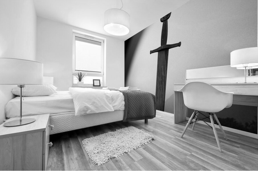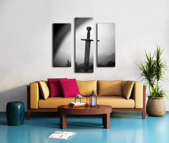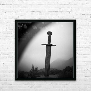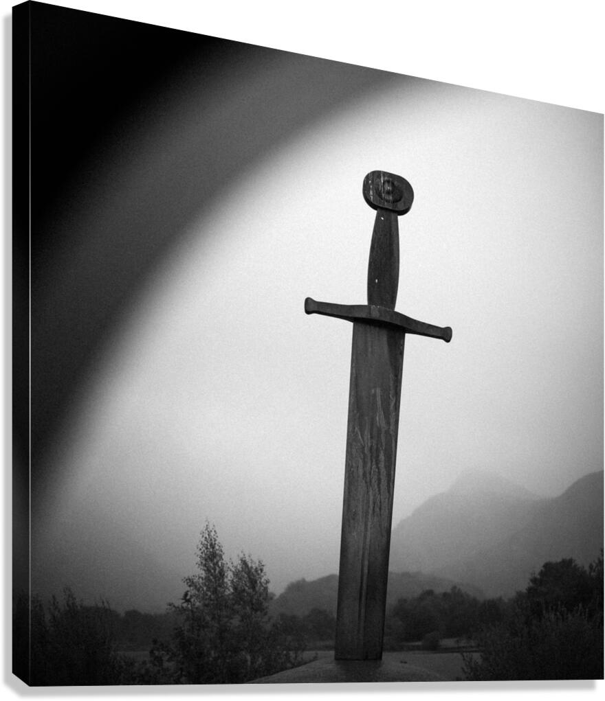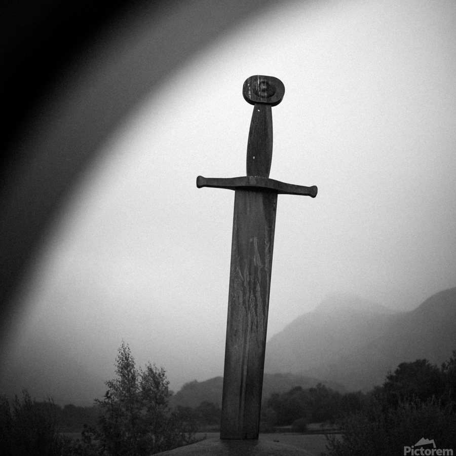 Set against the brooding mountains of Llanberis in North Wales the Blade of the Giants stands tall and solemn its weathered form clear against a murky fog-laced sky. The sculpture commands attention evoking echoes of legend and myth a monumental symbol of strength rooted in the rugged Welsh landscape. The subdued monochrome tones heighten its presence giving the scene a cinematic quality that bridges history and imagination. The imposing sword dominates the composition standing as if it has watched over the valleys for centuries unwavering and eternal. A perfect photograph for lovers of mythic landscapes Celtic heritage and dramatic outdoor scenes. This image is available as wall art and across a wide range of formats to suit your space or style. ..... Please Note: This image is intentionally presented with a grainy texture as part of its aesthetic.