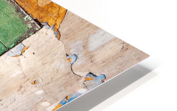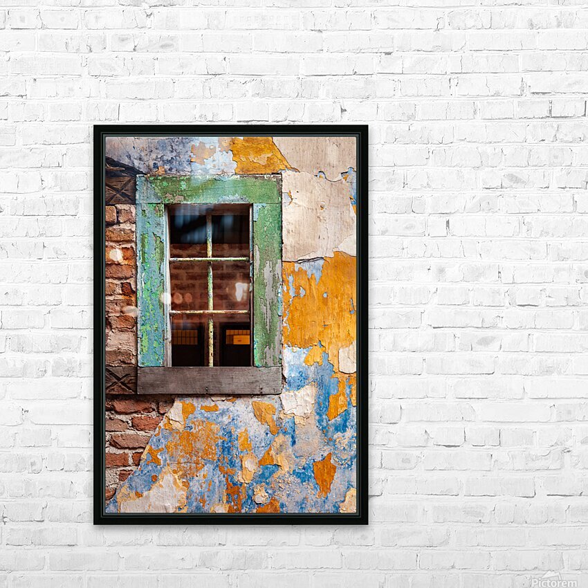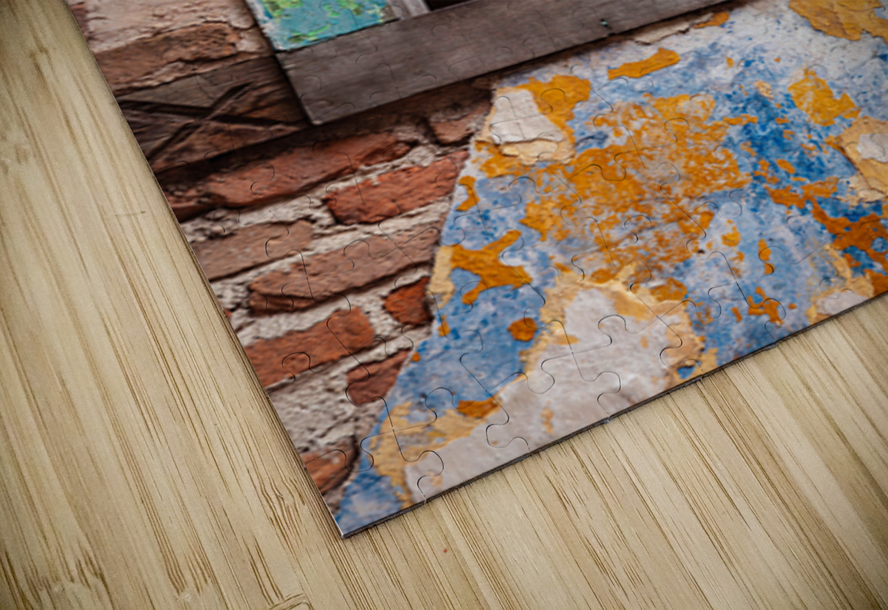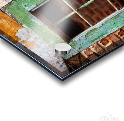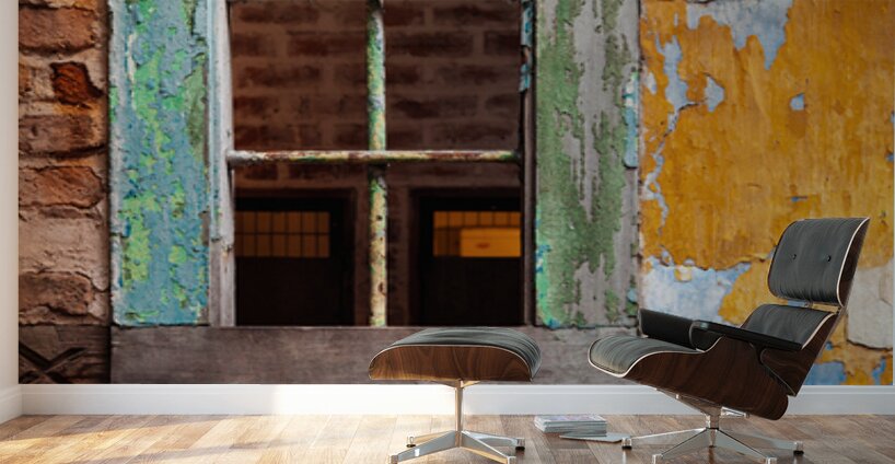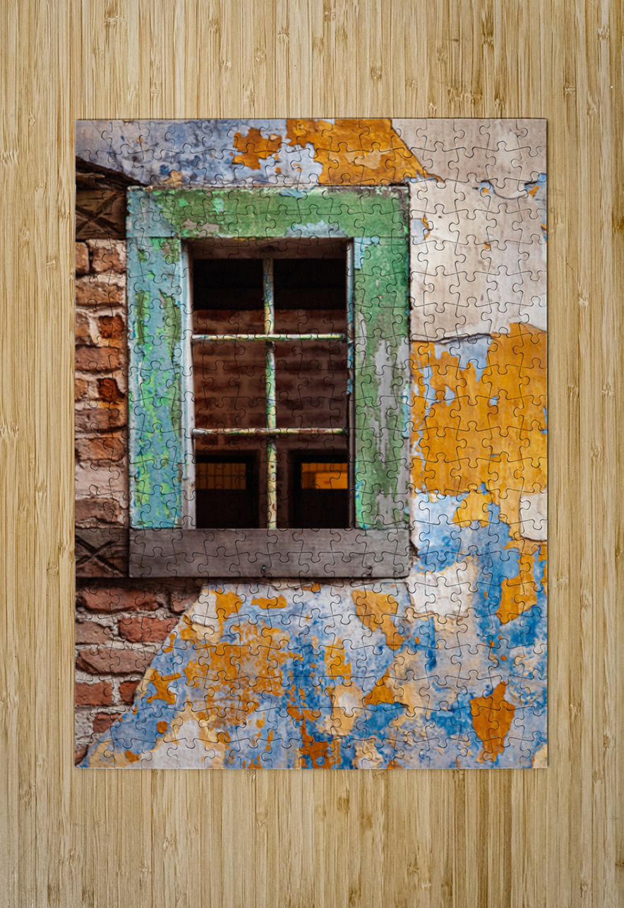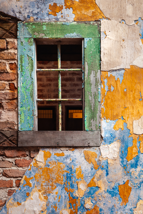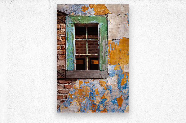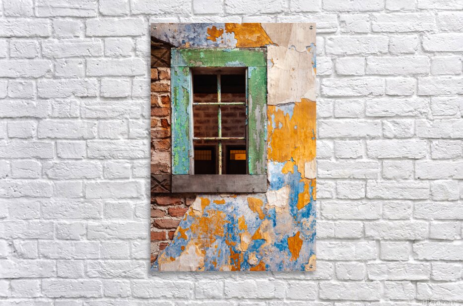Layers of peeling paint in blue yellow and green surround a small wooden window revealing the textured brickwork beneath. The mix of colours and surfa...[+]
