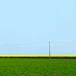 A single telegraph pole stands in the open countryside dividing clean bands of green yellow and blue beneath a cloudless sky. The mustard field stretc...[+]