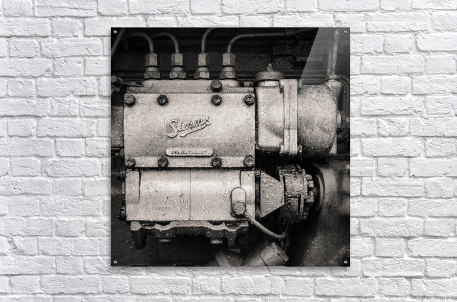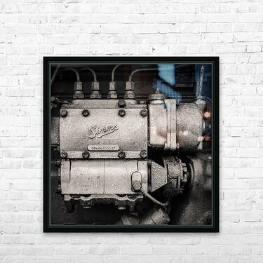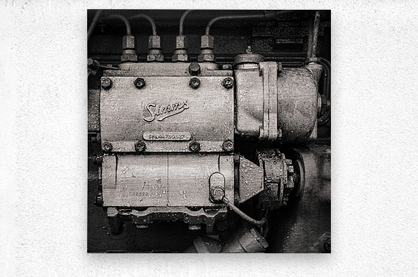 Steel rust and a whisper of history in an antique engine component a Simms inline fuel-injection pump. The weathered finish droplets of condensation and the sculptural form create a visual heartbeat of industrial age craftsmanship captured here in timeless monochrome. This piece is part of a vintage tractor’s engine where Simms injection pumps were widely used across British tractors in the 1950s and 60s. With its mix of functional precision and rugged wear this component speaks of power purpose and decades of service. A great image for anyone with a love of mechanical heritage industrial texture or nostalgic engine details. This image is available as wall art and across a wide range of formats to suit your space or style. ..... Please Note: This image is intentionally presented with a grainy texture as part of its aesthetic.