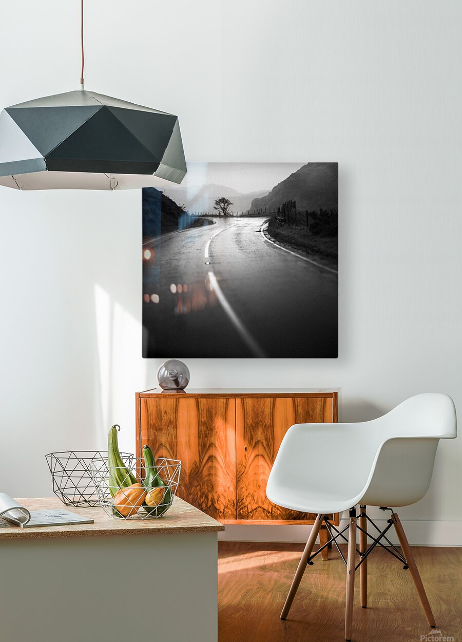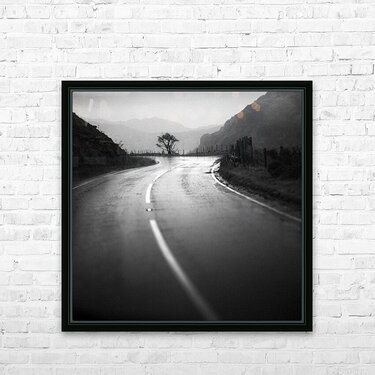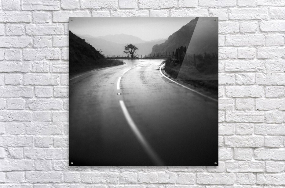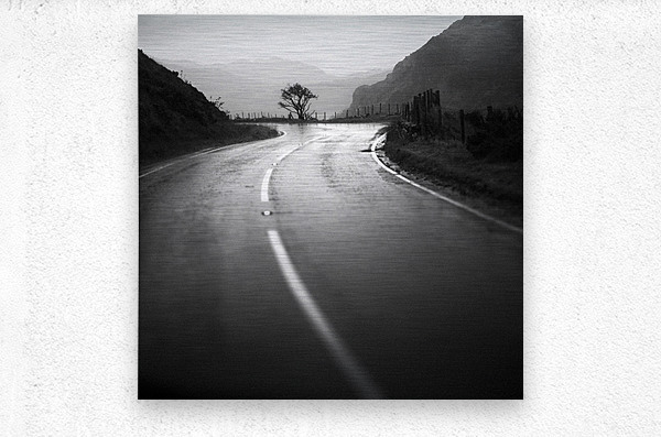 Rain darkens the winding road through the rugged landscape of Snowdonia or Eryri in Welsh as it curves gently toward a lone wind-shaped tree standing against a misty backdrop of mountains. The glistening tarmac reflects the soft light of the overcast sky creating a quiet moody atmosphere that captures the beauty and solitude of the Welsh countryside. Snowdonia National Park known locally as Eryri is celebrated for its dramatic peaks shifting light and untamed weather that can transform a scene within moments. This image distils that essence balancing the graceful curve of the road with the starkness of the lone tree and the soft gradients of distant hills. A perfect photograph for those drawn to atmospheric landscapes and minimalist compositions. This image is available as wall art and across a wide range of formats to suit your space or style. ..... Please Note: This image is intentionally presented with a grainy texture as part of its aesthetic.
