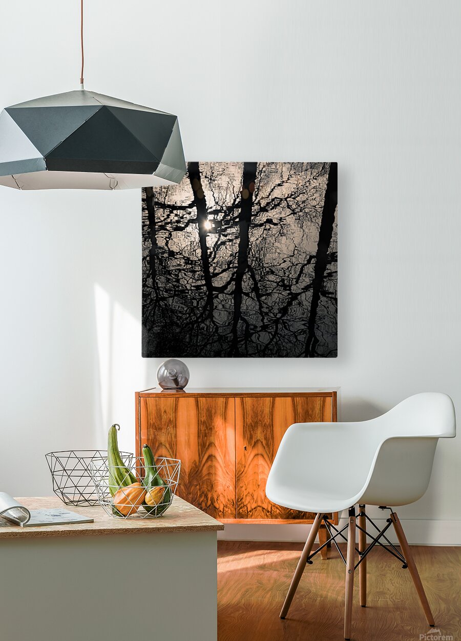 Dutch waters reflect the silhouettes of tall trees as they ripple with every small movement on the surface of a canal. The branches distort and stretch into abstract patterns as if the world above is being gently rearranged in the water below. A soft burst of sunlight breaks through the reflection catching attention and giving the whole moment a feeling of stillness. This reflection comes from a Dutch canal in winter where bare branches and low light create an unexpected kind of beauty. With no wind and no distractions the water becomes a natural mirror turning an everyday scene into something calm minimal and quietly dramatic. A perfect photograph for creating a peaceful reflective atmosphere in a living space or workspace. This image is available as wall art and across a wide range of formats to suit your space or style.