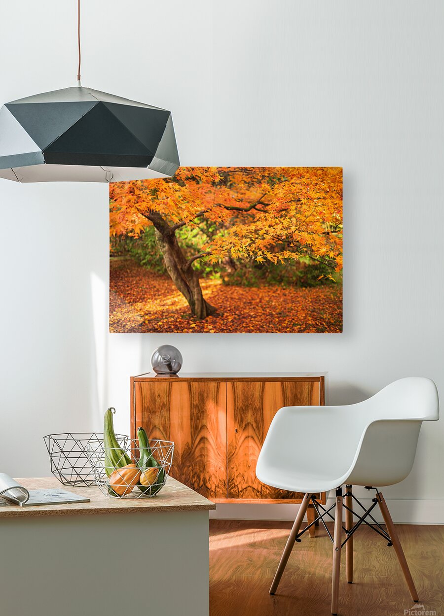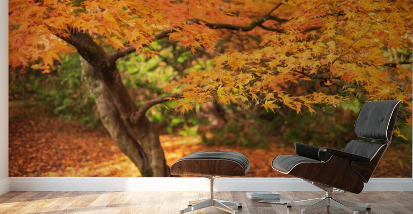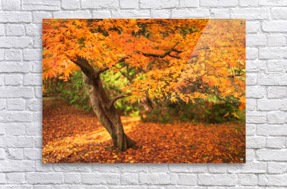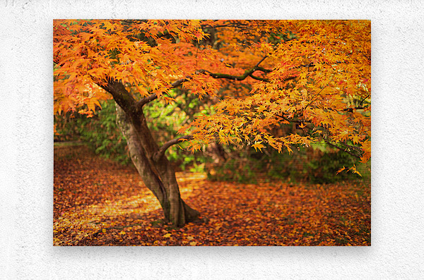 A Japanese Maple stands in full autumn colour its leaves glowing in shades of orange and gold. A low branch reaches across the frame drawing the eye to the delicate shapes of the leaves as they catch the warm light. The ground beneath is covered in a soft carpet of fallen colour giving the whole scene a calm inviting feel. This tree is found at Westonbirt Arboretum in the United Kingdom a place known for its remarkable collection of maples and its vibrant autumn displays. The twisting trunk and sweeping canopy reflect the character these trees develop over time. A perfect photograph for anyone who loves autumn landscapes or the quiet beauty of Japanese Maples. This image is available as wall art and across a wide range of formats to suit your space or style.