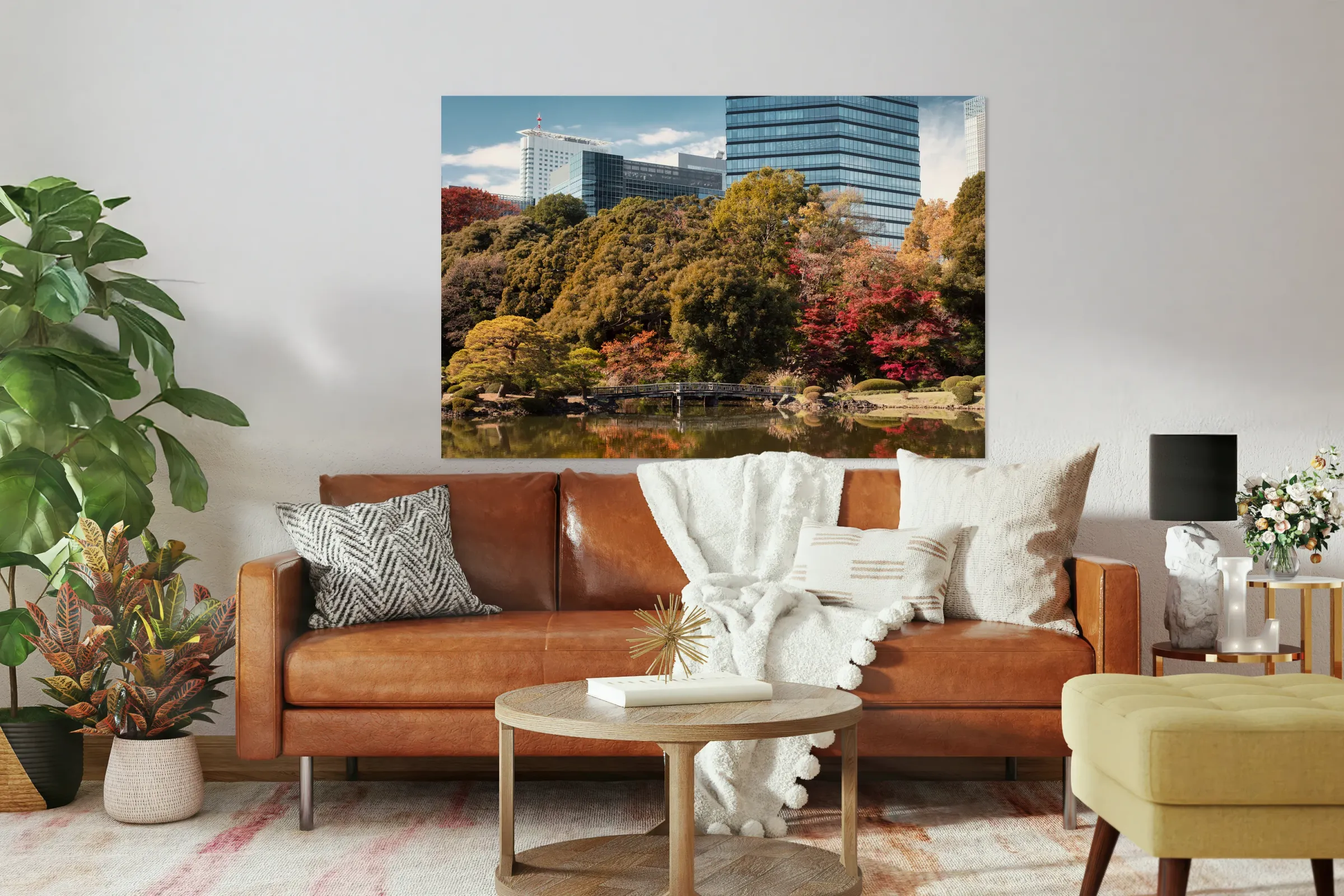 Autumn colour gathers quietly around the pond at Shinjuku Gyoen where layered trees shift from green to gold and deep red. Reflections settle on the water’s surface softening the scene and allowing the garden to breathe even as the city rises just beyond the frame. There is a sense of pause here a moment where nature holds its ground amid the surrounding geometry of Tokyo. Shinjuku Gyoen National Garden is one of Tokyo’s most celebrated green spaces blending traditional Japanese landscaping with open lawns and carefully designed vistas. Once part of an imperial estate the garden now offers a rare sense of openness in the heart of the city. In autumn its varied tree species bring a richness of colour that contrasts naturally with the modern skyline behind. A perfect photograph for spaces that suit calm reflective imagery with a subtle urban edge. This image is available as wall art and across a wide range of formats to suit your space or style.
