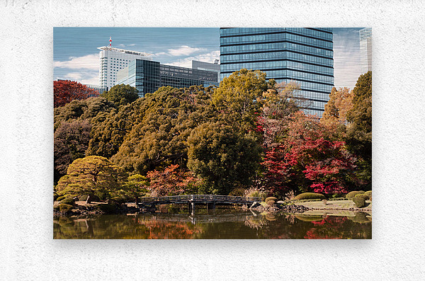 Autumn colour gathers quietly around the pond at Shinjuku Gyoen where layered trees shift from green to gold and deep red. Reflections settle on the water’s surface softening the scene and allowing the garden to breathe even as the city rises just beyond the frame. There is a sense of pause here a moment where nature holds its ground amid the surrounding geometry of Tokyo. Shinjuku Gyoen National Garden is one of Tokyo’s most celebrated green spaces blending traditional Japanese landscaping with open lawns and carefully designed vistas. Once part of an imperial estate the garden now offers a rare sense of openness in the heart of the city. In autumn its varied tree species bring a richness of colour that contrasts naturally with the modern skyline behind. A perfect photograph for spaces that suit calm reflective imagery with a subtle urban edge. This image is available as wall art and across a wide range of formats to suit your space or style.