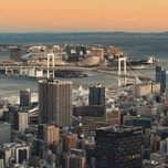 Tokyo Bay opens out beneath the city as the light softens and the buildings settle into the quieter pace of evening. Rainbow Bridge stretches across t...[+]