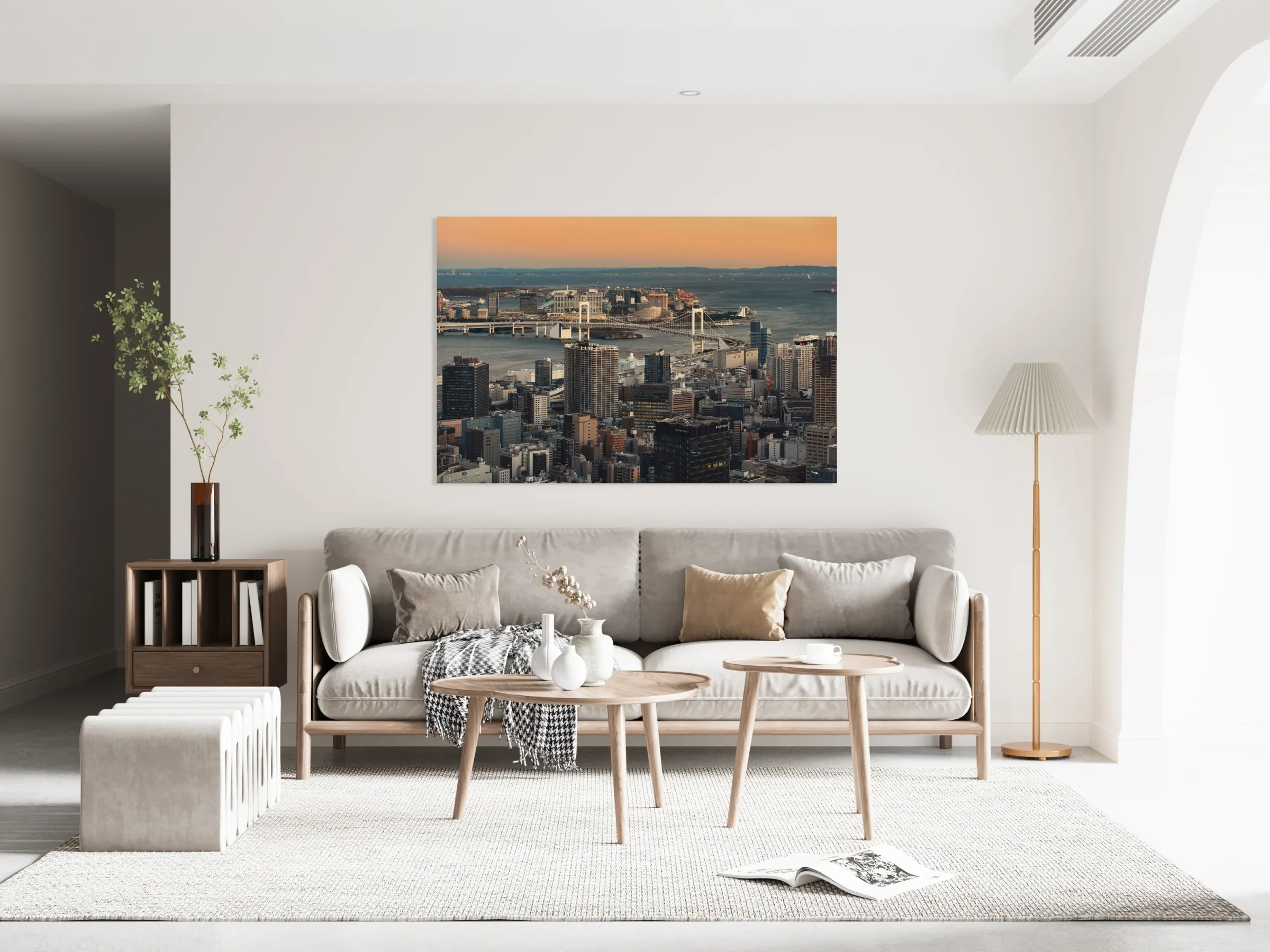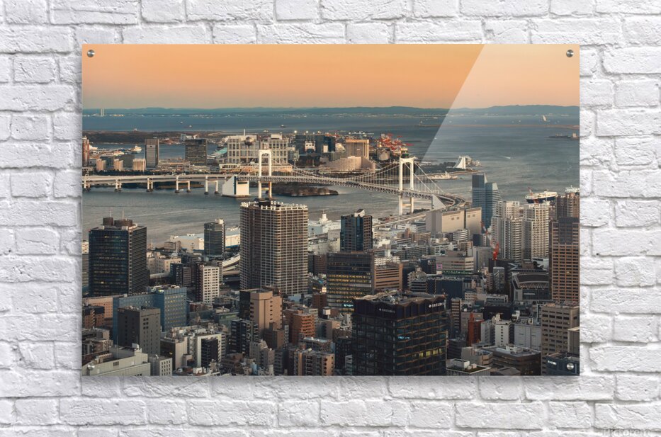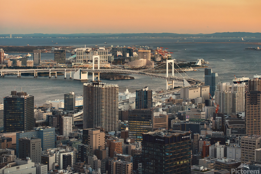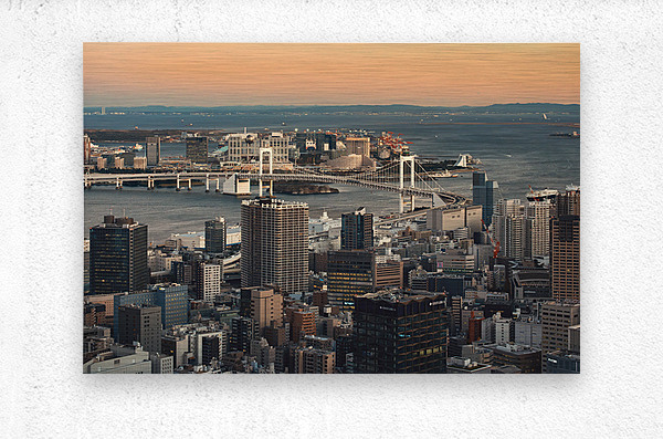 Tokyo Bay opens out beneath the city as the light softens and the buildings settle into the quieter pace of evening. Rainbow Bridge stretches across the water with calm confidence linking the dense blocks of the city to the open space of the bay beyond. There is a balance here between scale and stillness where the weight of the skyline is eased by the water and the fading warmth in the sky. Rainbow Bridge is one of Tokyo’s most recognisable landmarks spanning Tokyo Bay and connecting central Tokyo with the Odaiba waterfront. Completed in 1993 it has become a symbol of the city’s modern expansion and its relationship with the surrounding water. This view captures the transition from day to night a familiar moment in a city that never truly stops moving. A great image for lovers of cityscapes modern architecture and Japanese urban scenes. This image is available as wall art and across a wide range of formats to suit your space or style.