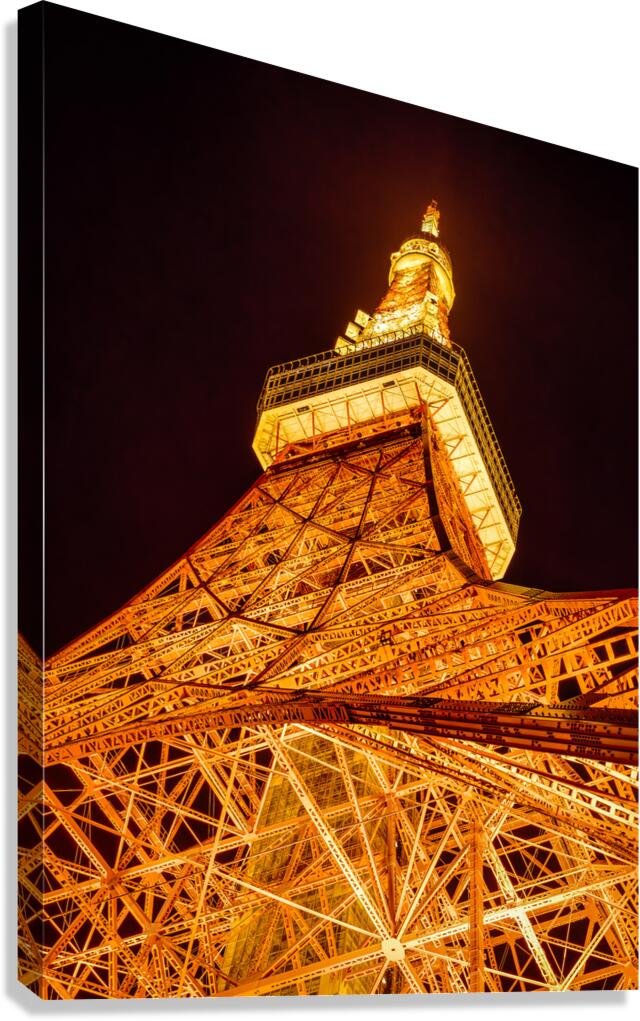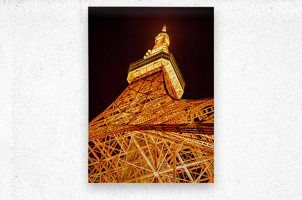 Tokyo Tower rises sharply into the night sky its lattice structure glowing in rich amber light from the ground up. Seen from this low angle the steel framework fills the frame with repeating lines and geometric detail creating a bold and striking presence. The deep black sky isolates the tower completely allowing the warm illumination to dominate and giving the image a strong graphic impact that feels confident and iconic. Completed in 1958 Tokyo Tower has long been one of the city’s most recognisable landmarks inspired by the Eiffel Tower but firmly rooted in Japan’s post war modern identity. At night its lighting transforms the structure into a beacon over the city emphasising both its engineering and its symbolic role within Tokyo’s skyline. A perfect photograph for lovers of urban architecture iconic city landmarks and dramatic night scenes. This image is available as wall art and across a wide range of formats to suit your space or style.