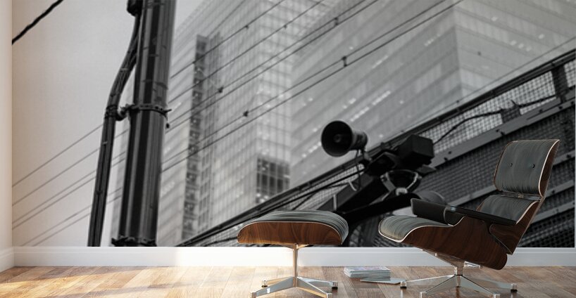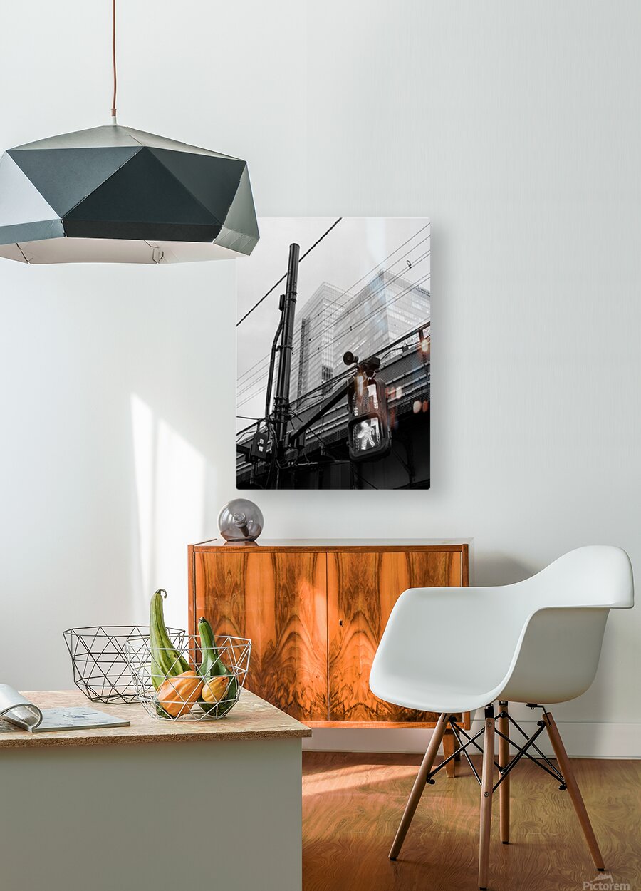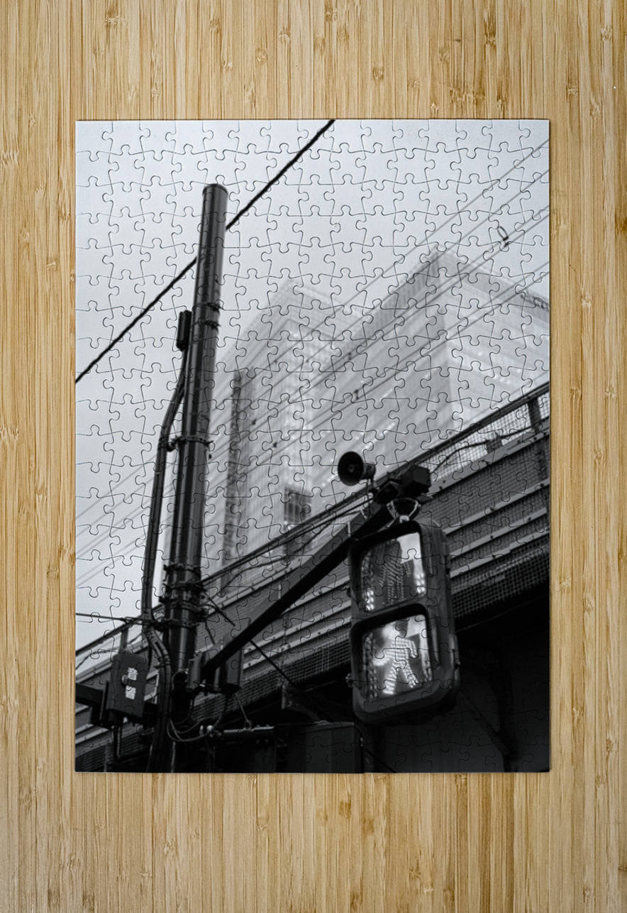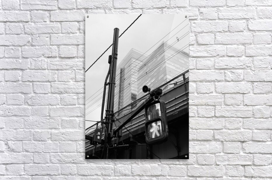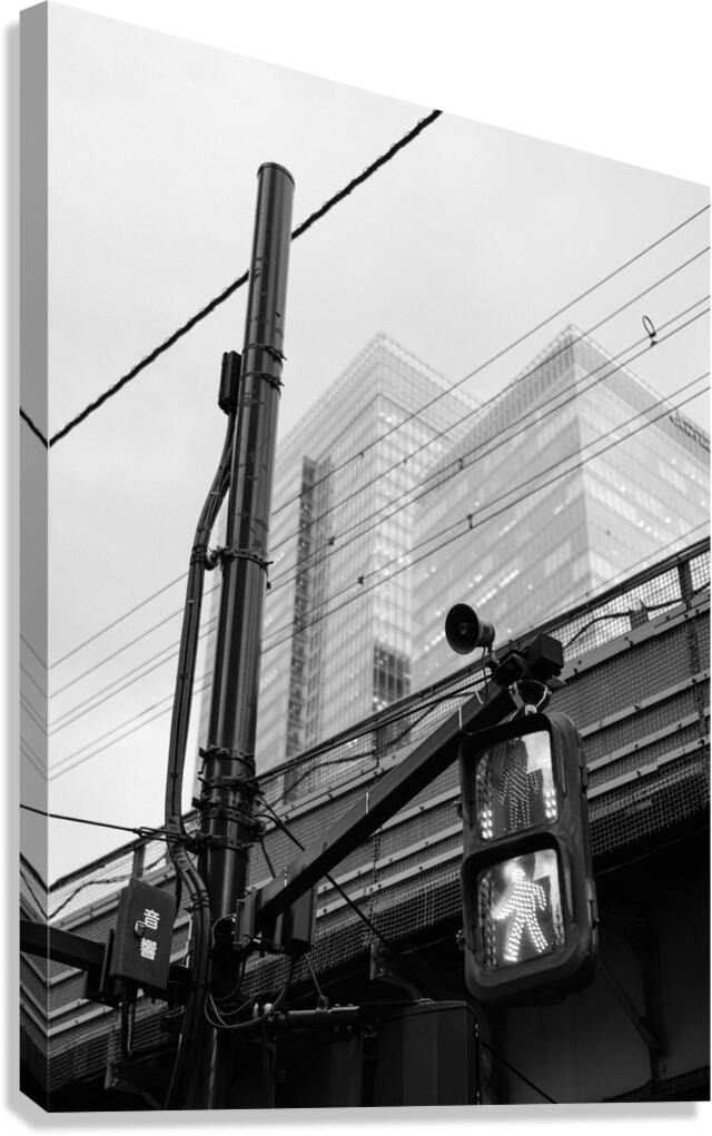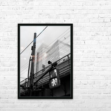 An illuminated pedestrian signal cuts through the darker tones of a street scene in Chiyoda City its bright figure standing out against the tangle of cables metal framework and shadowed structures around it. Behind the crossing light the glass towers near Tokyo Station rise softly into the background their forms partially diffused by the evening light. The contrast between the sharp signal and the layered city elements creates a clean striking urban moment. This photograph was taken close to Tokyo Station in Chiyoda City one of the capital’s busiest and most architecturally varied districts. The area combines historic rail infrastructure with modern office buildings overhead wiring and elevated roadways. Pedestrian signals like this are a familiar sight in central Tokyo guiding the constant flow of people through the city’s dense and highly organised street network. A perfect photograph for fans of black and white city photography minimalist urban scenes or modern architectural detail. This image is available as wall art and across a wide range of formats to suit your space or style.
