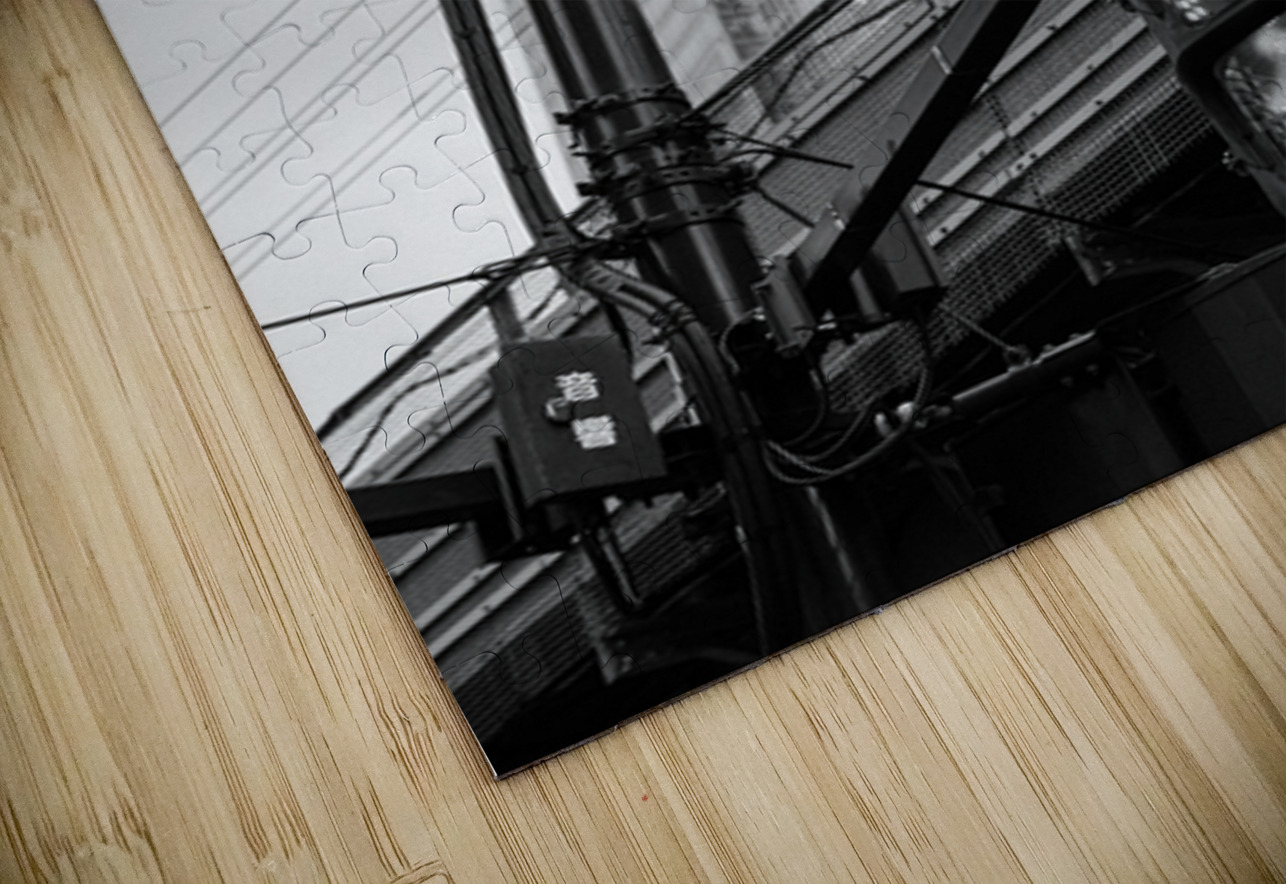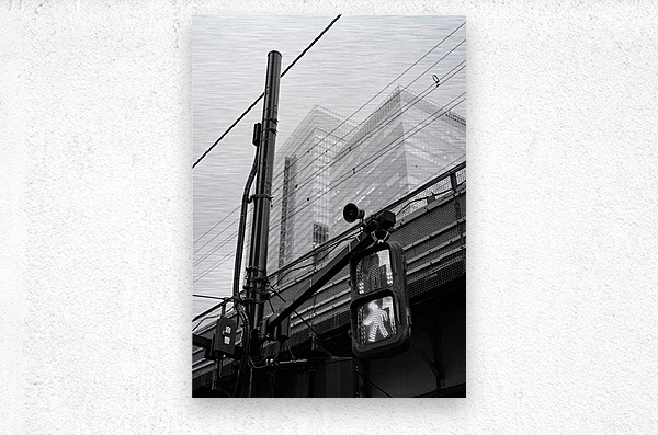 An illuminated pedestrian signal cuts through the darker tones of a street scene in Chiyoda City its bright figure standing out against the tangle of cables metal framework and shadowed structures around it. Behind the crossing light the glass towers near Tokyo Station rise softly into the background their forms partially diffused by the evening light. The contrast between the sharp signal and the layered city elements creates a clean striking urban moment. This photograph was taken close to Tokyo Station in Chiyoda City one of the capital’s busiest and most architecturally varied districts. The area combines historic rail infrastructure with modern office buildings overhead wiring and elevated roadways. Pedestrian signals like this are a familiar sight in central Tokyo guiding the constant flow of people through the city’s dense and highly organised street network. A perfect photograph for fans of black and white city photography minimalist urban scenes or modern architectural detail. This image is available as wall art and across a wide range of formats to suit your space or style.