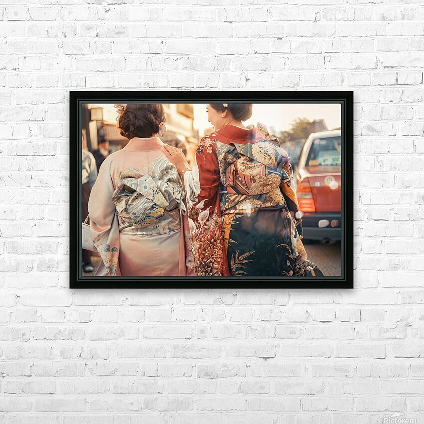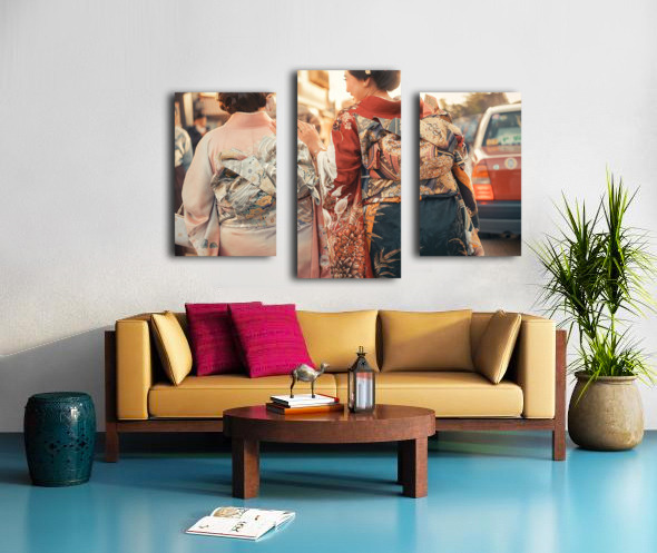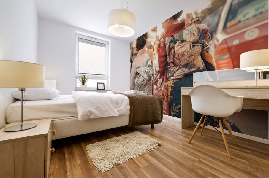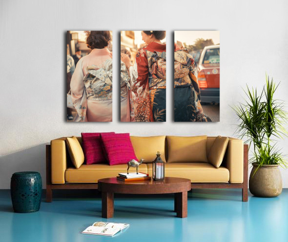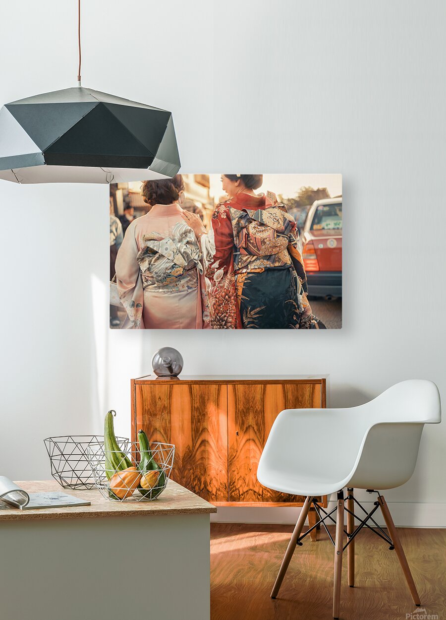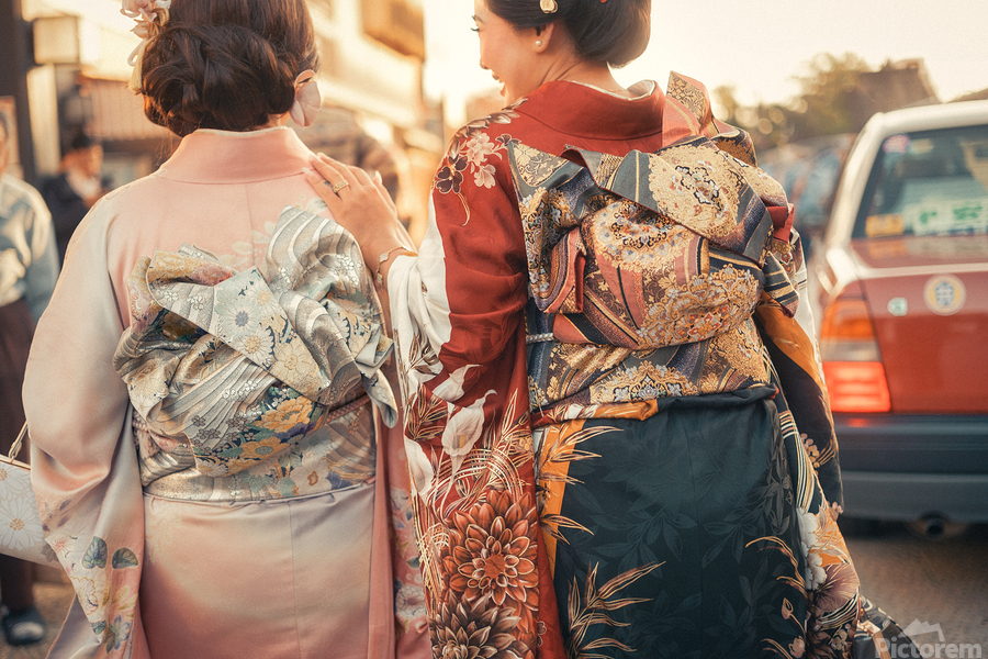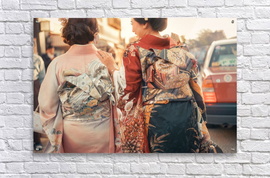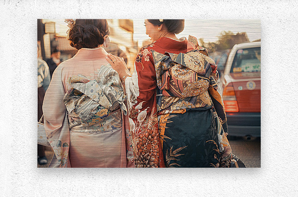 Two Kyoto geiko walk side by side through a city street relaxed and at ease as they chat together. Their richly patterned kimono and carefully tied obi fill the frame with colour and detail while the everyday surroundings of Kyoto carry on around them. The moment feels unposed and natural offering a quiet glimpse of traditional dress moving through modern urban life. Kyoto remains one of the few cities where geiko culture is still actively practiced with distinctive clothing and formal training rooted in centuries of history. Seeing them outside formal settings highlights how these traditions continue to exist within the rhythm of contemporary city life especially in areas connected to classical arts and entertainment. A perfect photograph for those who appreciate Japanese culture traditional dress and authentic street scenes from historic cities. This image is available as wall art and across a wide range of formats to suit your space or style.