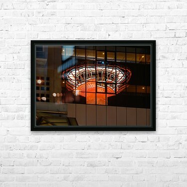 Kyoto Tower appears as a glowing reflection across the dark glass windows of an office building in central Kyoto its bright orange structure standing out against the surrounding night scene. The grid of the building’s facade breaks the tower’s shape into repeating panels creating a striking layered view of the city’s most recognisable landmark. Warm interior lights from the offices add depth to the scene blending the modern urban setting with the tower’s bold presence. Kyoto Tower is the tallest structure in the city and has served as a symbol of post-war Kyoto since its completion in 1964. Located near Kyoto Station it rises above the surrounding low-rise buildings and is often illuminated after dark making it a prominent feature of the city skyline. Reflections like this offer an alternative way of viewing the tower showing how it interacts with the modern architecture around it. A perfect photograph for fans of urban photography Japanese city scenes and contemporary architecture. This image is available as wall art and across a wide range of formats to suit your space or style.