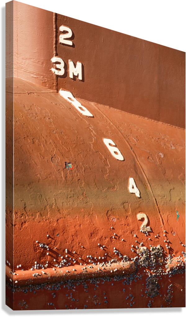 Draught markings cut through layers of painted red hull pock marks and surface wear on a boat moored in Osaka harbour creating a strong tactile image rooted in function rather than decoration. The contrast between the clean stencilled numbers and the worn paintwork gives the surface a quiet visual tension where everyday utility becomes the main point of interest. It is an image that draws attention through texture and repetition rather than spectacle. Osaka is one of Japan’s major port cities with a long history shaped by shipping trade and working harbours like this. Draught numbers are essential reference points used to judge depth and loading while the weathering and marine growth reflect constant exposure to water movement and time. These marks are the natural result of use telling a straightforward story of a vessel that works for a living. A perfect photograph for those drawn to industrial details maritime subjects or imagery that values surface wear and quiet authenticity. This image is available as wall art and across a wide range of formats to suit your space or style.