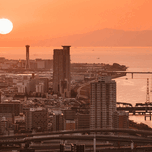 Osaka Bay settles into evening as the sun drops low over the water bathing the city in a deep warm glow. The layered skyline stretches across the fram...[+]