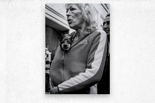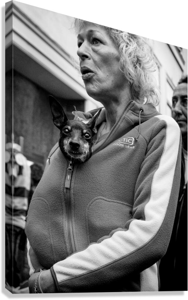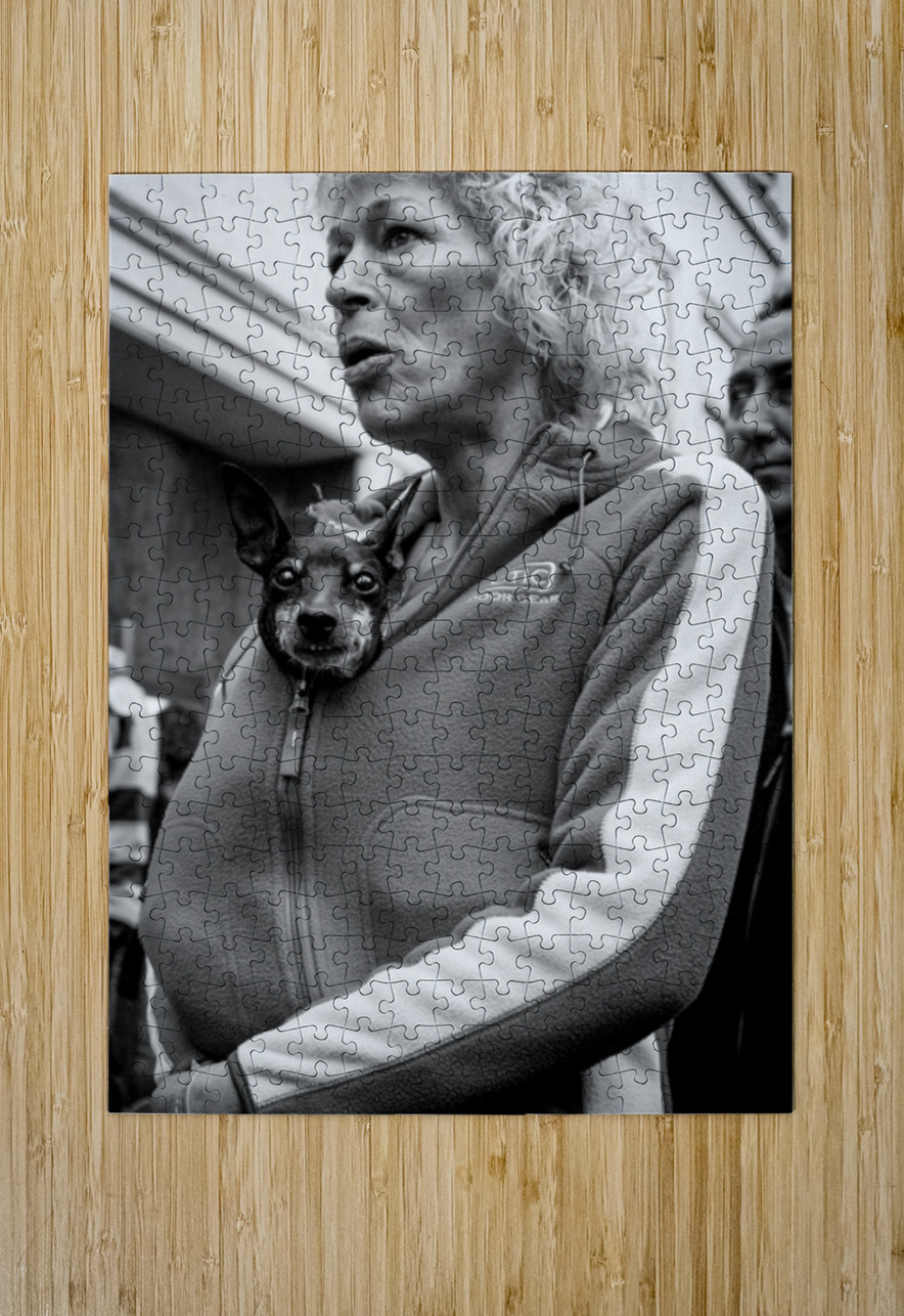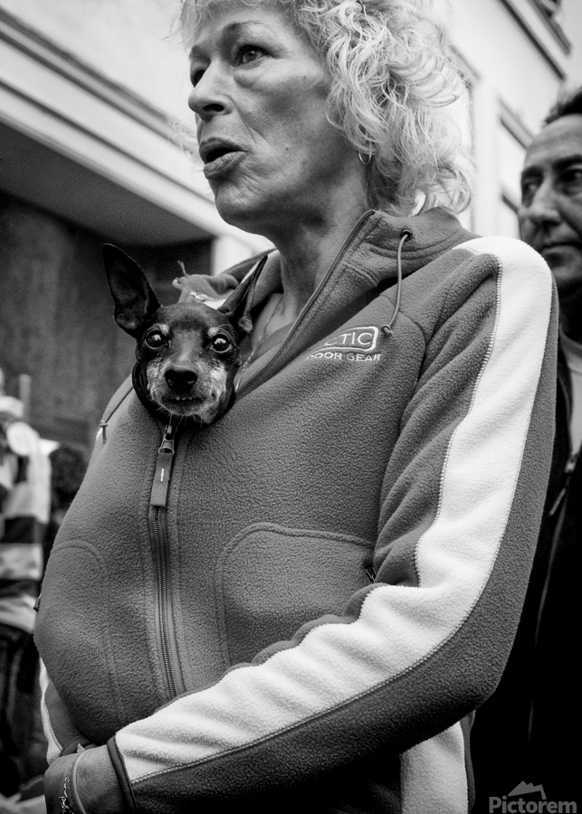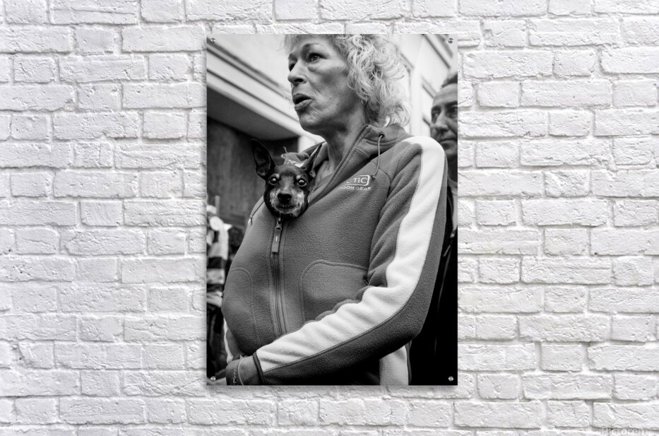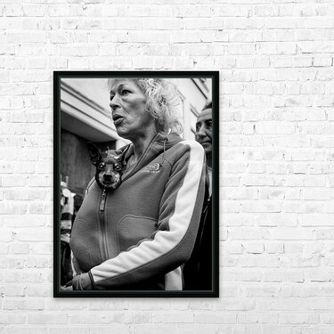 A small dog peeks out from a woman’s tracksuit top on the streets of Leiden, Netherlands, photographed in 2008 and looking straight into the camera. The close, unexpected moment gives the scene a playful, intimate feel, turning an everyday street encounter into something quietly humorous and human. Leiden is a historic Dutch city known for its lived-in streets and relaxed pace of life, and this image reflects that everyday character. Rather than a posed scene, it captures a fleeting moment of connection, where curiosity and personality come through in a simple glance. A perfect image for dog lovers, street photography fans, or anyone who enjoys characterful, lighthearted artwork with a human touch. This image is available as wall art and across a wide range of formats to suit your space or style.
