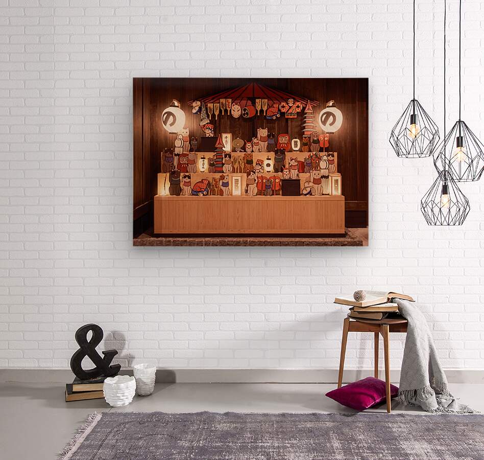 A tiered display of traditional Japanese lucky charms arranged neatly on hina-dan stands against a rich wooden backdrop. Rows of maneki-neko daruma dolls and tai figurines sit alongside hagoita paddles and spinning tops their varied shapes and expressions creating a lively but carefully balanced scene. A red wagasa parasol crowns the display while soft white lanterns on either side cast a warm glow that draws you in to explore each small detail. This installation is located at Onyado Nono Asakusa Bettei a ryokan style hotel in the Asakusa district of Tokyo. Positioned in the passage connecting the north and south sides of the building it acts as a welcoming focal point for guests. Alongside traditional engimono symbols of good fortune you can also spot Dormy Inko the original mascot of the Dormy Inn hotel chain subtly woven into the arrangement. A perfect photograph for lovers of Japanese culture travel enthusiasts and anyone drawn to colourful characterful interior details. This image is available as wall art and across a wide range of formats to suit your space or style.