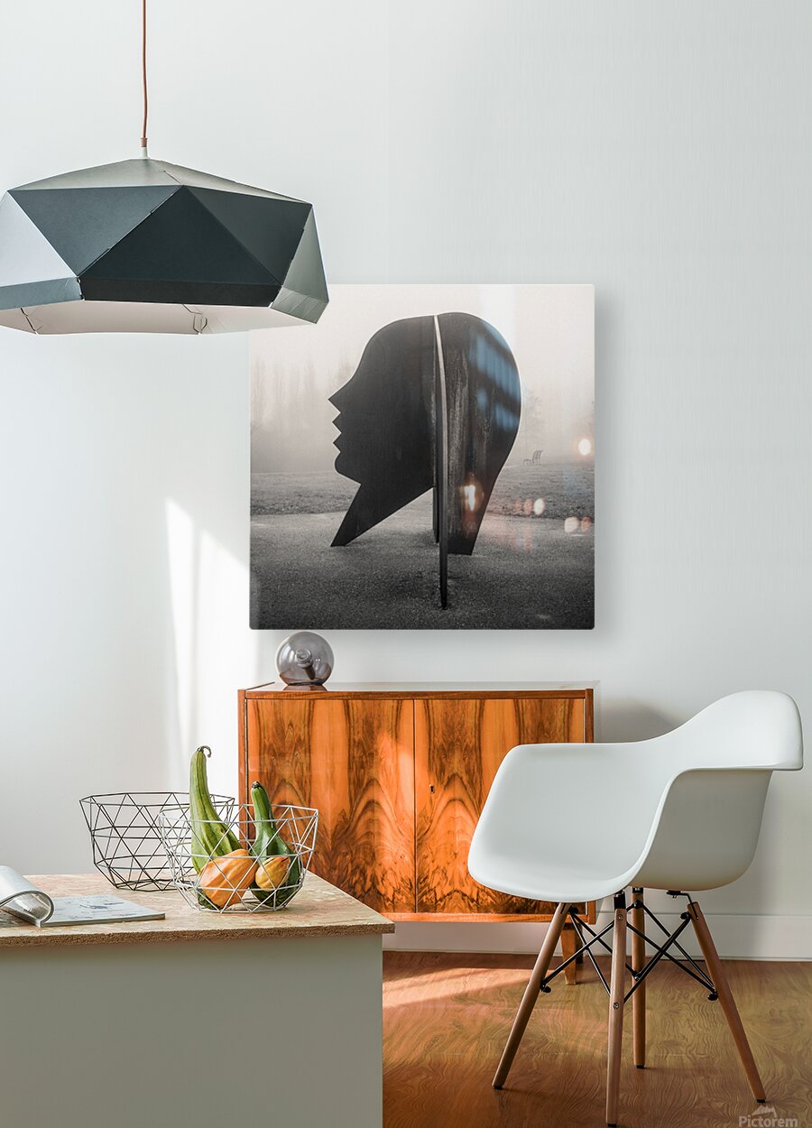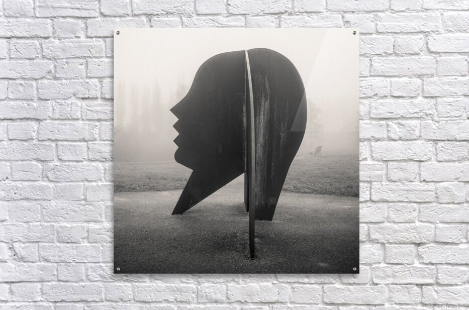The Head stands quietly in the fog its dark steel profile cutting a bold silhouette against the softened landscape. On a misty day in Campbell Park Milton Keynes the sculpture feels even more introspective its shifting planes and human outline revealing themselves slowly as you move around it. There is something contemplative in the way it holds its shape at once solid and elusive encouraging a slower pace and a second look. Created by British artist Allen Jones in 1990 the work is made from weathering steel that gradually develops its rich textured surface over time. Designed to play with perception the sculpture shifts between abstraction and recognisable human form depending on your viewpoint. Located near the canal towards Newlands it is one of the notable public artworks that contribute to the character of Campbell Park. A perfect photograph for collectors of contemporary sculpture public art and atmospheric monochrome scenes. This image is available as wall art and across a wide range of formats to suit your space or style.