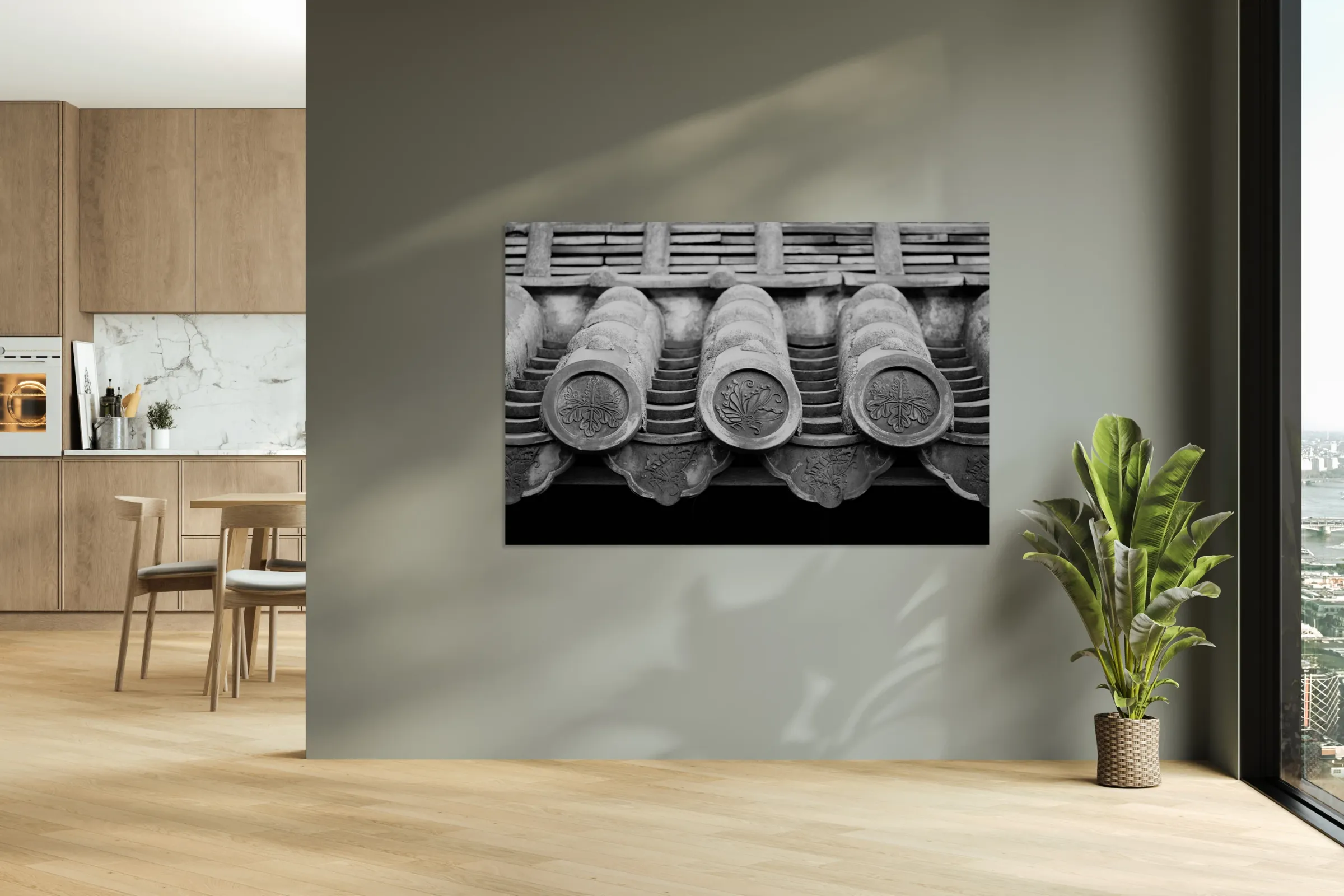 A row of ornate end tiles known as gatou lines the roof of Himeji Castle in Himeji Japan each one bearing a carved crest that speaks to its symbolic role in traditional Japanese architecture. The repetition of these circular forms creates a steady rhythm across the frame while the subtle differences in texture and wear give each tile its own presence. It’s a close look at craftsmanship that’s easy to miss at a distance but defines the character of the structure. Himeji Castle is one of Japan’s most well preserved historic castles and a UNESCO World Heritage Site. These decorative tiles were designed not only to protect the roofline but also to display family or clan crests reflecting status and identity within feudal Japan. A perfect photograph for collectors of Japanese architectural detail historic craftsmanship and refined design elements. This image is available as wall art and across a wide range of formats to suit your space or style.
