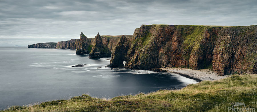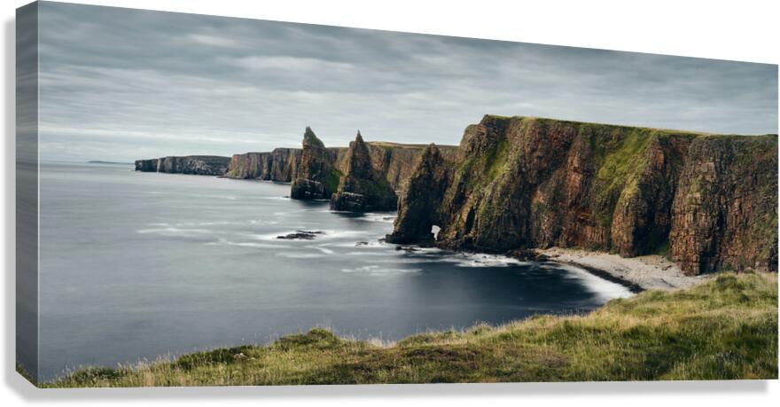The coastline at Duncansby Head stretches out in a long rugged sweep where sheer cliffs give way to narrow inlets and rising sea stacks that stand just offshore. There’s a quiet sense of scale to the scene the dark water sitting heavy beneath the cliffs while the land pushes outward in broken weathered edges shaped by time and exposure to the North Sea. Located at the northeastern tip of mainland Scotland in Caithness Duncansby Head is known for its distinctive stacks and dramatic coastal formations. These natural structures have been carved by centuries of erosion creating one of the most recognisable and visually striking coastal landscapes in the UK. A perfect photograph for those drawn to dramatic coastlines geological formations and the raw exposed beauty of northern Scotland. This image is available as wall art and across a wide range of formats to suit your space or style.