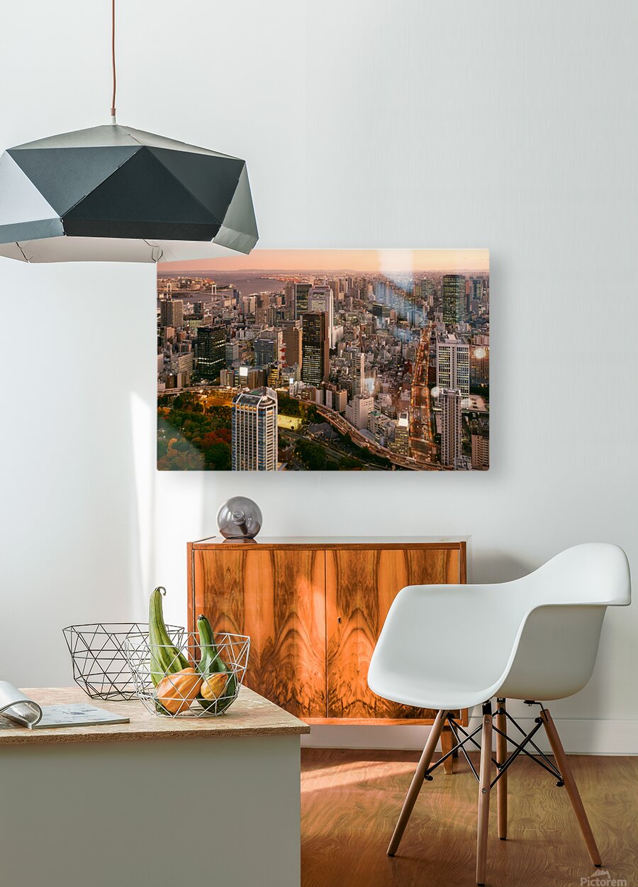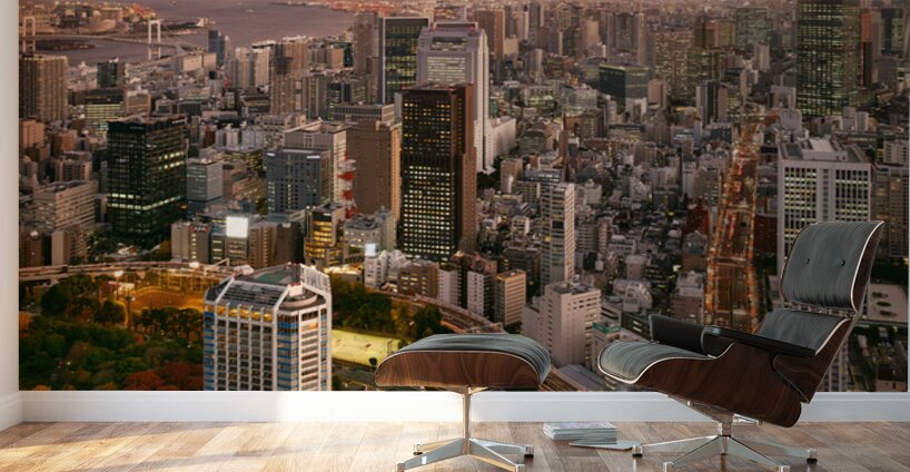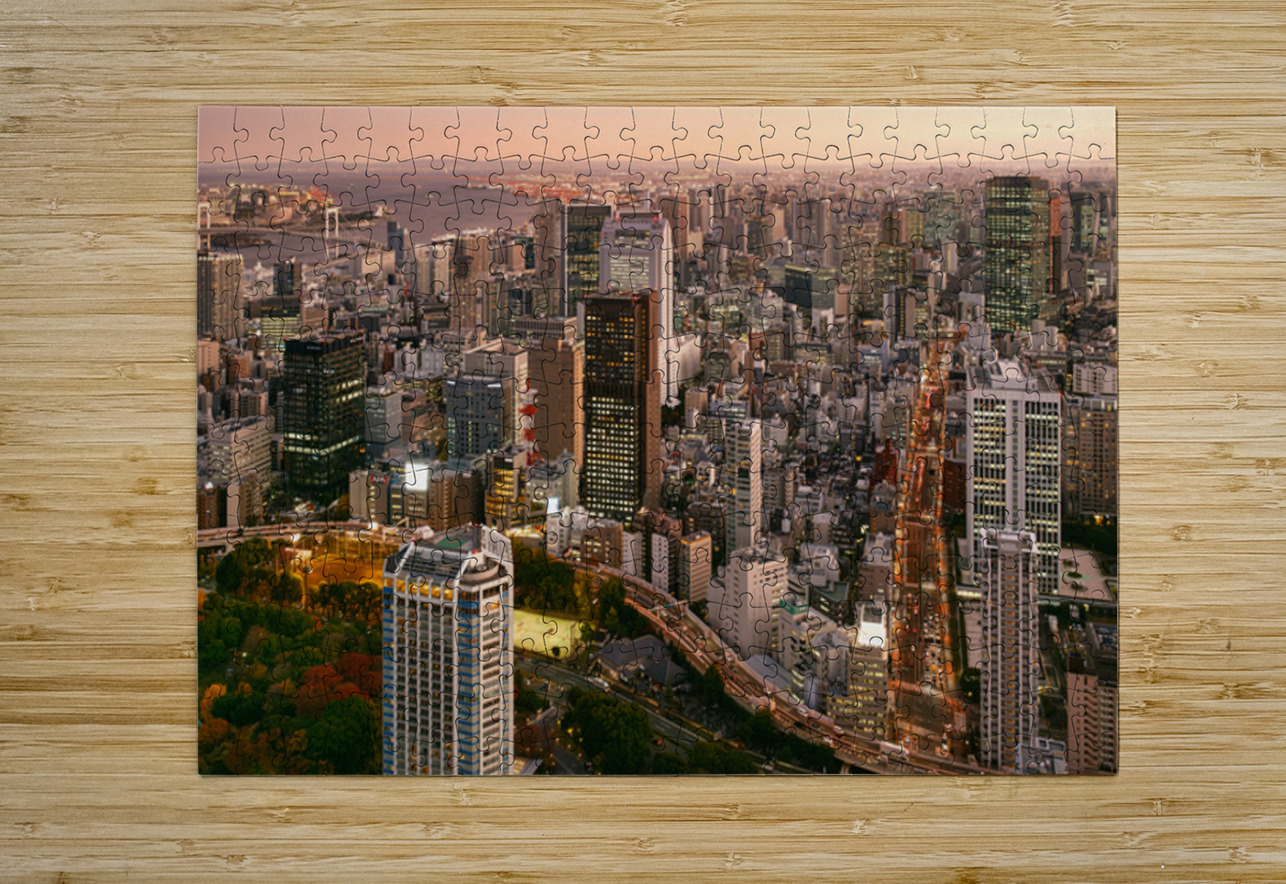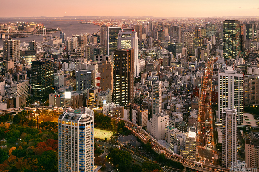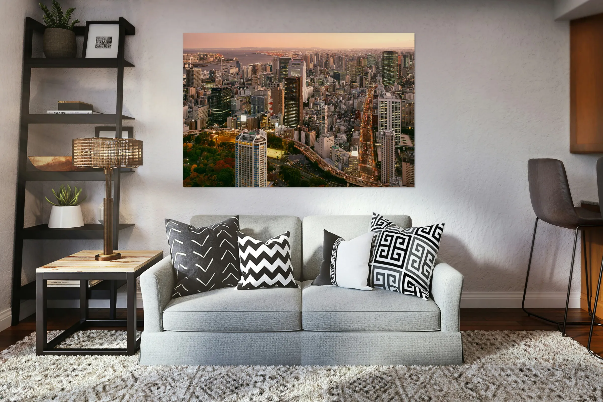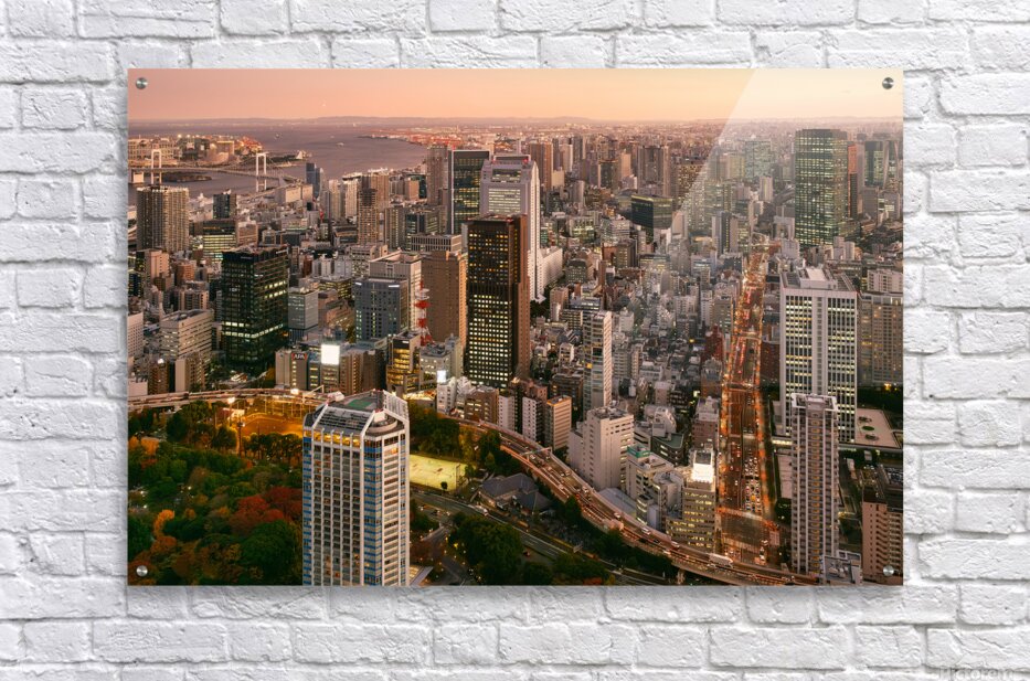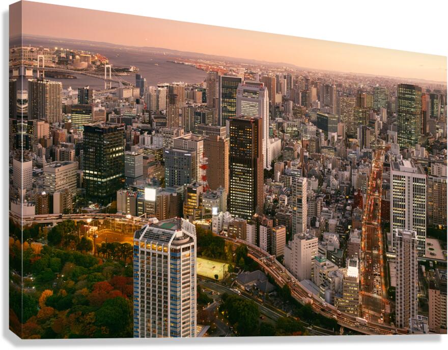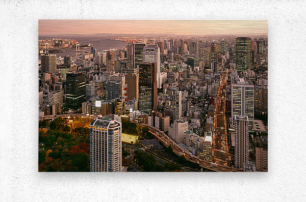 As the day fades over Tokyo Minato City settles into that brief in-between moment where the last warmth of the sky meets the first signs of the city coming alive. From above the streets begin to glow in thin winding lines while the dense grid of buildings stretches toward the bay giving a real sense of just how vast and layered this part of the city is. Minato is one of Tokyo’s central wards known for its mix of business districts residential towers and access to Tokyo Bay. Landmarks like Tokyo Tower and the Rainbow Bridge sit within or just beyond this area and its elevated viewpoints offer some of the most expansive perspectives across the capital especially at sunset when the city shifts from day to night. A perfect photograph for those drawn to cityscapes urban scale and the evolving atmosphere of Tokyo at dusk. This image is available as wall art and across a wide range of formats to suit your space or style.