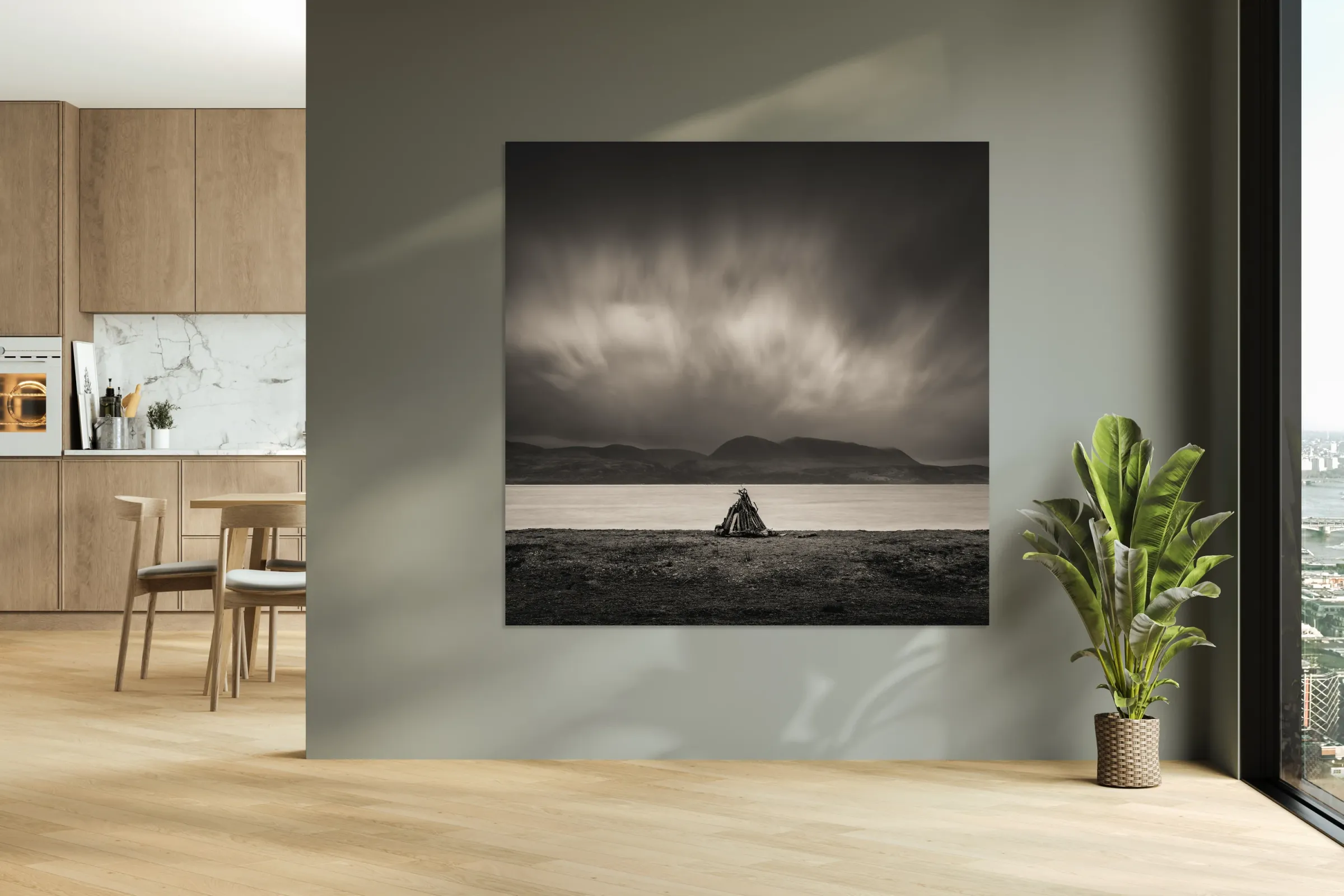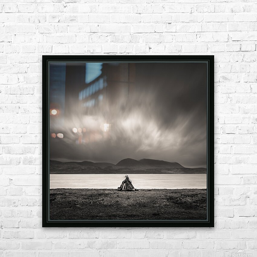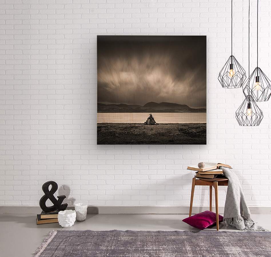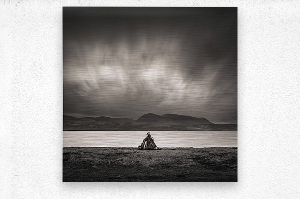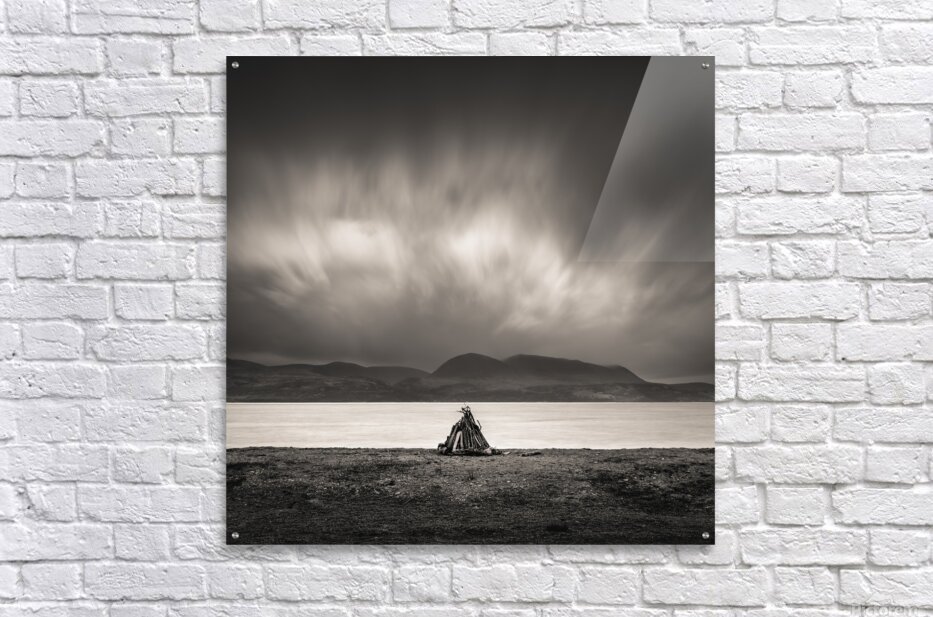 A small pile of driftwood sits alone on the shoreline at Skipness set against the wide stretch of water with the Isle of Arran rising in the distance. The scene feels stripped back and exposed the simple structure of the sticks standing out against the flat expanse of sea and the heavy sky gathering above. Skipness lies along the eastern edge of the Kintyre peninsula in Argyll and Bute looking directly across to Arran. The coastline here is open and quiet with long views shaped by weather and light where even small details on the shore take on a stronger presence against the scale of the landscape. A perfect photograph for those drawn to minimalist coastal scenes moody skies and the raw atmosphere of Scotland’s western shores. This image is available as wall art and across a wide range of formats to suit your space or style.