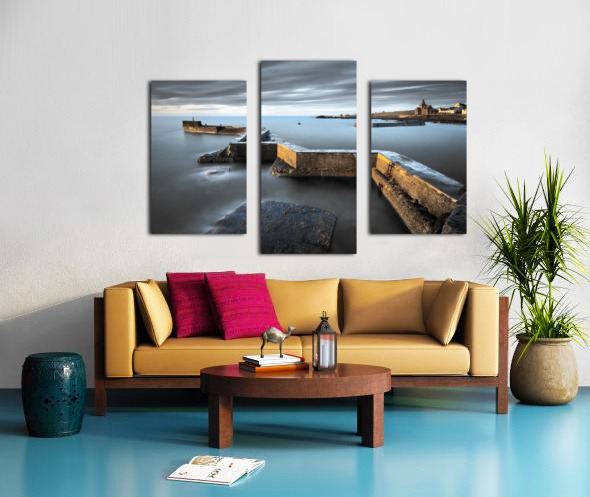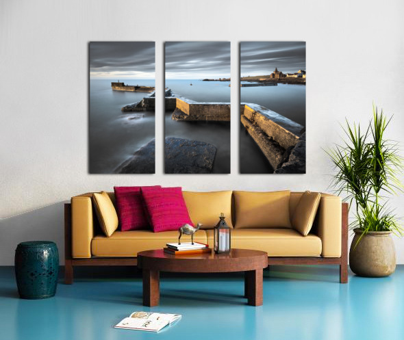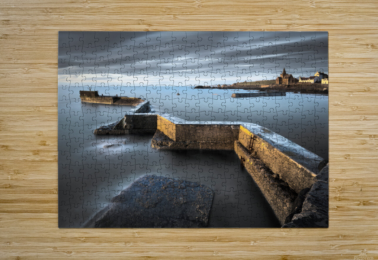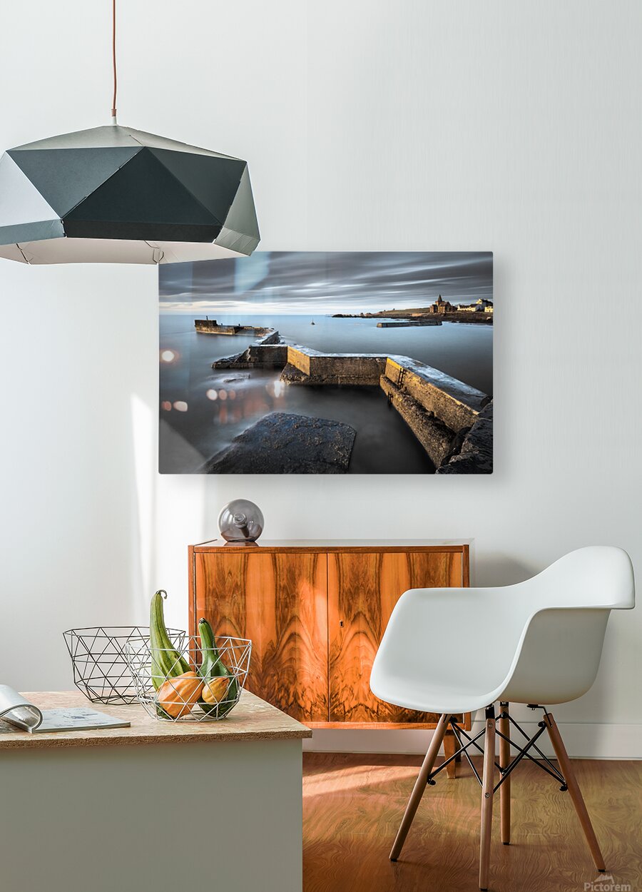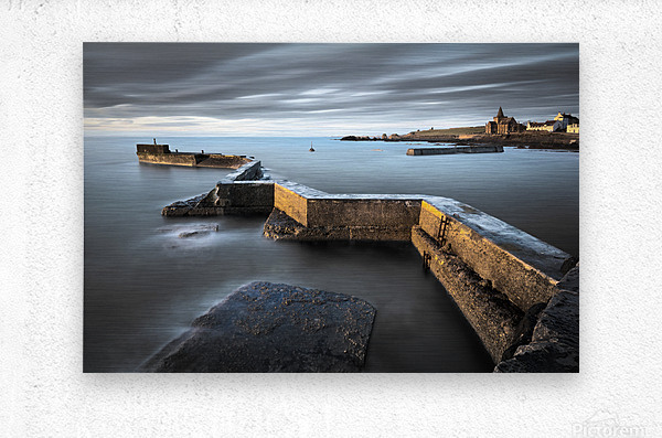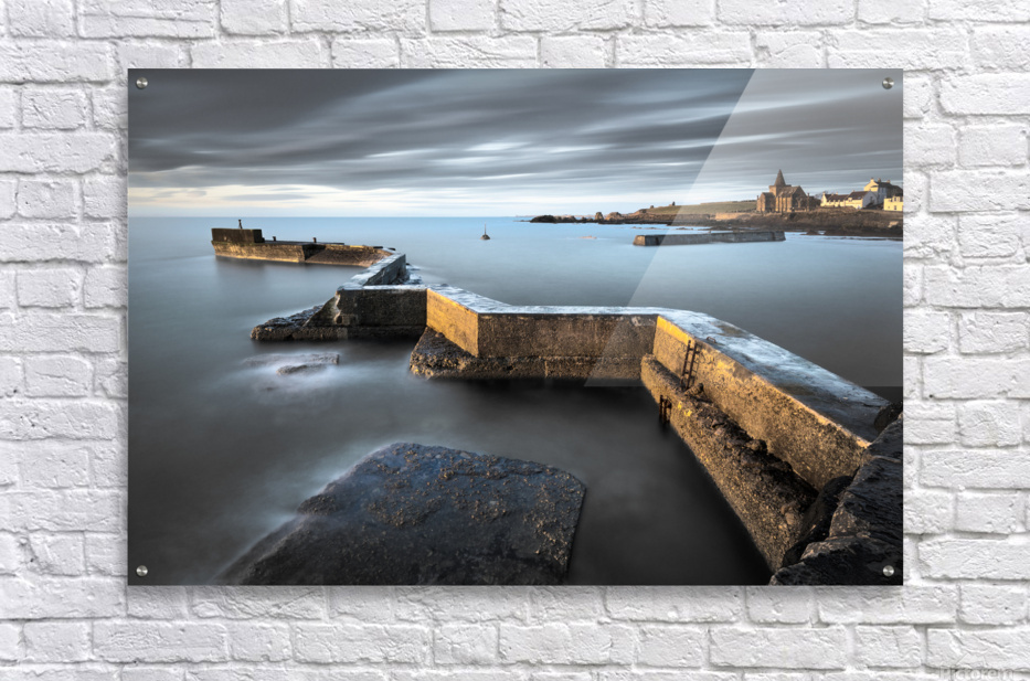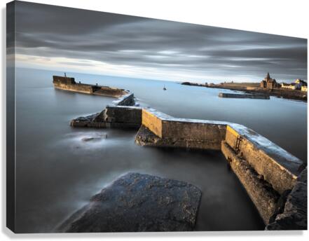 In St Monans, Fife, Scotland, first light catches the sharp angles of the zig zag breakwater, turning cold concrete into something almost golden against the still North Sea. The long, deliberate lines pull you outward into the calm, while the softened water and low sky create a quiet, steady mood that feels unhurried and grounded. There is a sense of resilience here, where structure meets sea, balanced by the gentle warmth of dawn. The breakwater at St Monans is known for its distinctive zig zag design, a functional harbour defence that has become one of the most recognisable coastal features in the East Neuk of Fife. With the village and historic church visible along the shoreline, it stands as both working infrastructure and an iconic subject for photographers drawn to Scotland’s maritime character. A perfect photograph for lovers of Scottish coastal scenes and minimalist seascapes. This image is available as wall art and across a wide range of formats to suit your space or style.