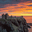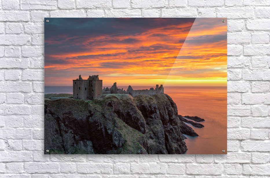 A fiery sunrise lights up the sky over Dunnottar Castle in Aberdeenshire, Scotland, casting the ancient ruins into a striking semi-silhouette against the vibrant dawn colors. The dramatic contrast between the castle and the sky creates a captivating scene that embodies the rugged beauty and historical significance of Scotland's landscape. Ideal for history enthusiasts, landscape photography lovers, or anyone captivated by Scotland's iconic landmarks.