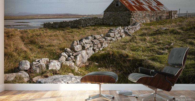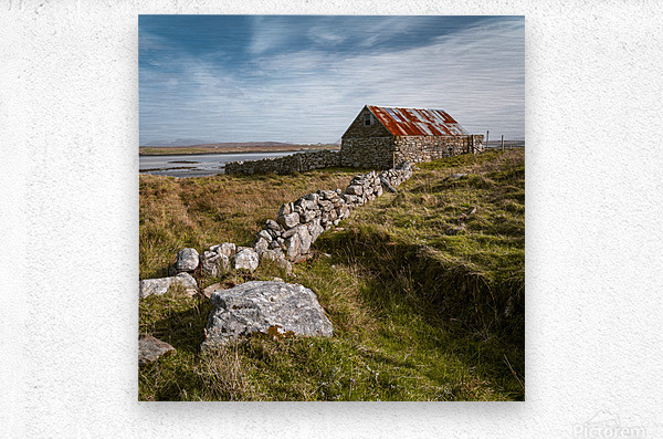 A photograph capturing an old barn on Baleshare, a flat tidal island in the Outer Hebrides near North Uist, Scotland. The scene features an aged stone...[+]
