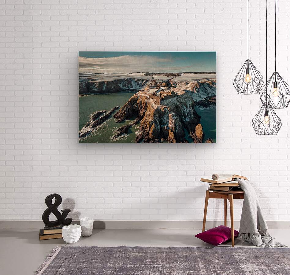 A breathtaking aerial view of Dunnottar Castle, enveloped in snow, near Stonehaven in Aberdeenshire, Scotland. The historic fortress is beautifully highlighted against a wintery landscape, showcasing its dramatic coastal position and rugged surroundings. Ideal for history enthusiasts, landscape lovers, and those captivated by Scottish heritage.