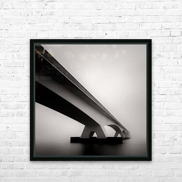 A monochrome photograph of the Zeeland Bridge (Zeelandbrug) captured on a foggy day in Zeeland, Netherlands. Shot from beneath the bridge, it showcase...[+]