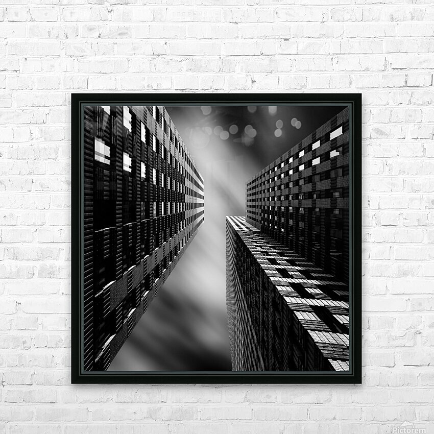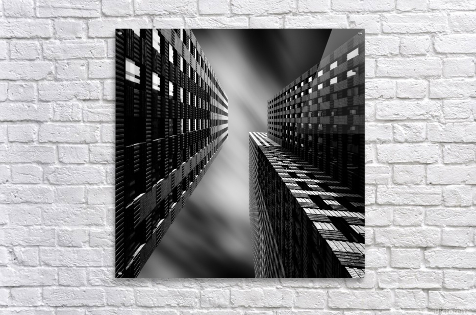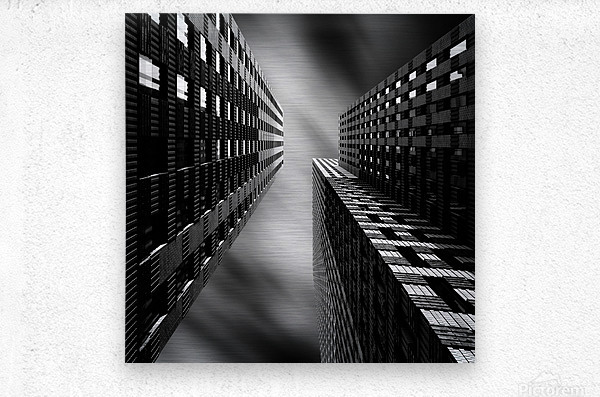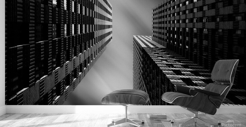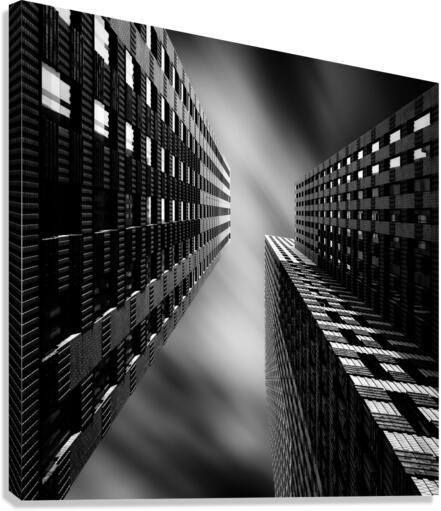 A monochrome long exposure photograph capturing the view from between two sleek modern apartment buildings in Amsterdam, Netherlands. The photograph highlights the architectural contrast and urban geometry of the scene, emphasizing the vertical lines and reflective surfaces of the buildings. The long exposure technique creates a smooth, ethereal sky, adding depth and texture to the composition. Ideal for showcasing contemporary urban architecture or for adding a touch of modern elegance to any space.