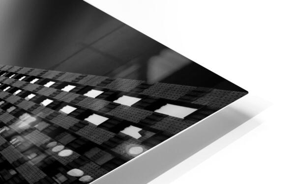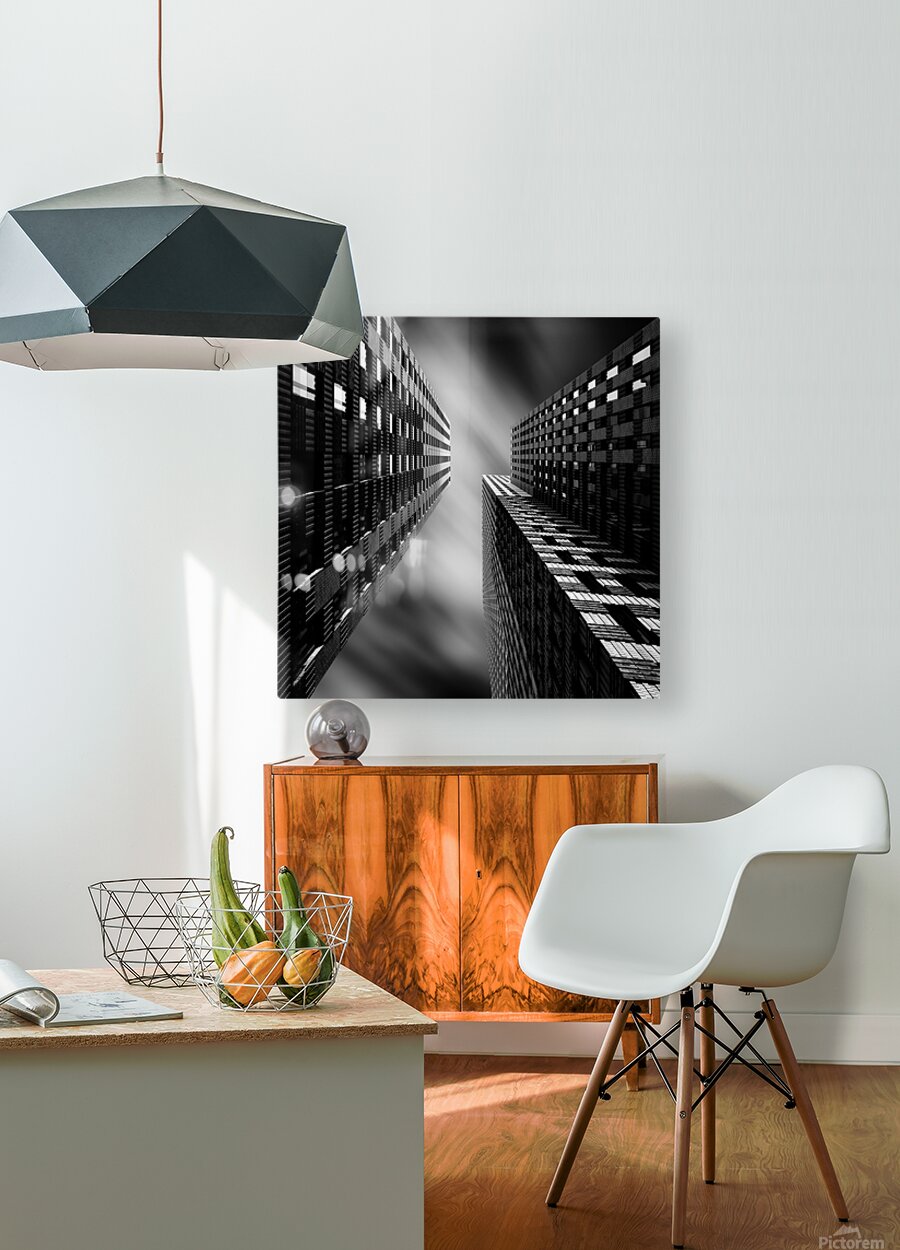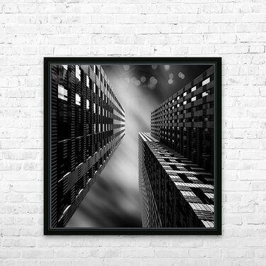 A monochrome long exposure photograph capturing the view from between two sleek modern apartment buildings in Amsterdam, Netherlands. The photograph h...[+]