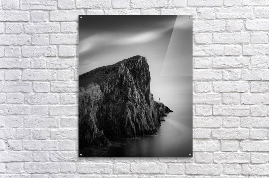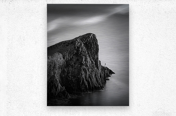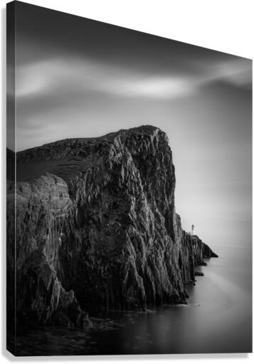 A monochrome long exposure of Neist Point Lighthouse on the Isle of Skye, Scotland, showcasing the dramatic cliffs leading up to the lighthouse in the...[+]