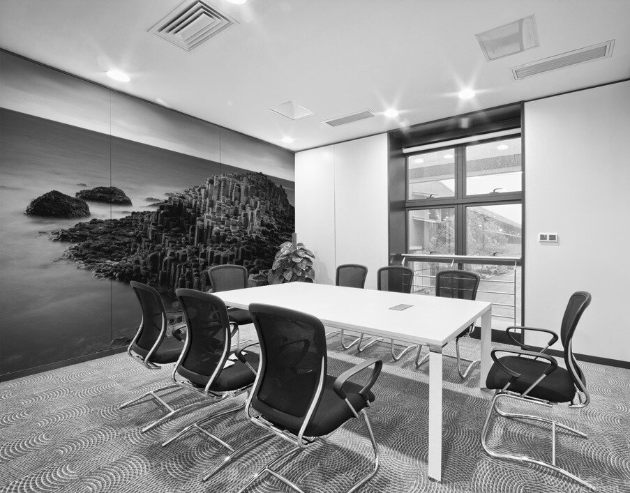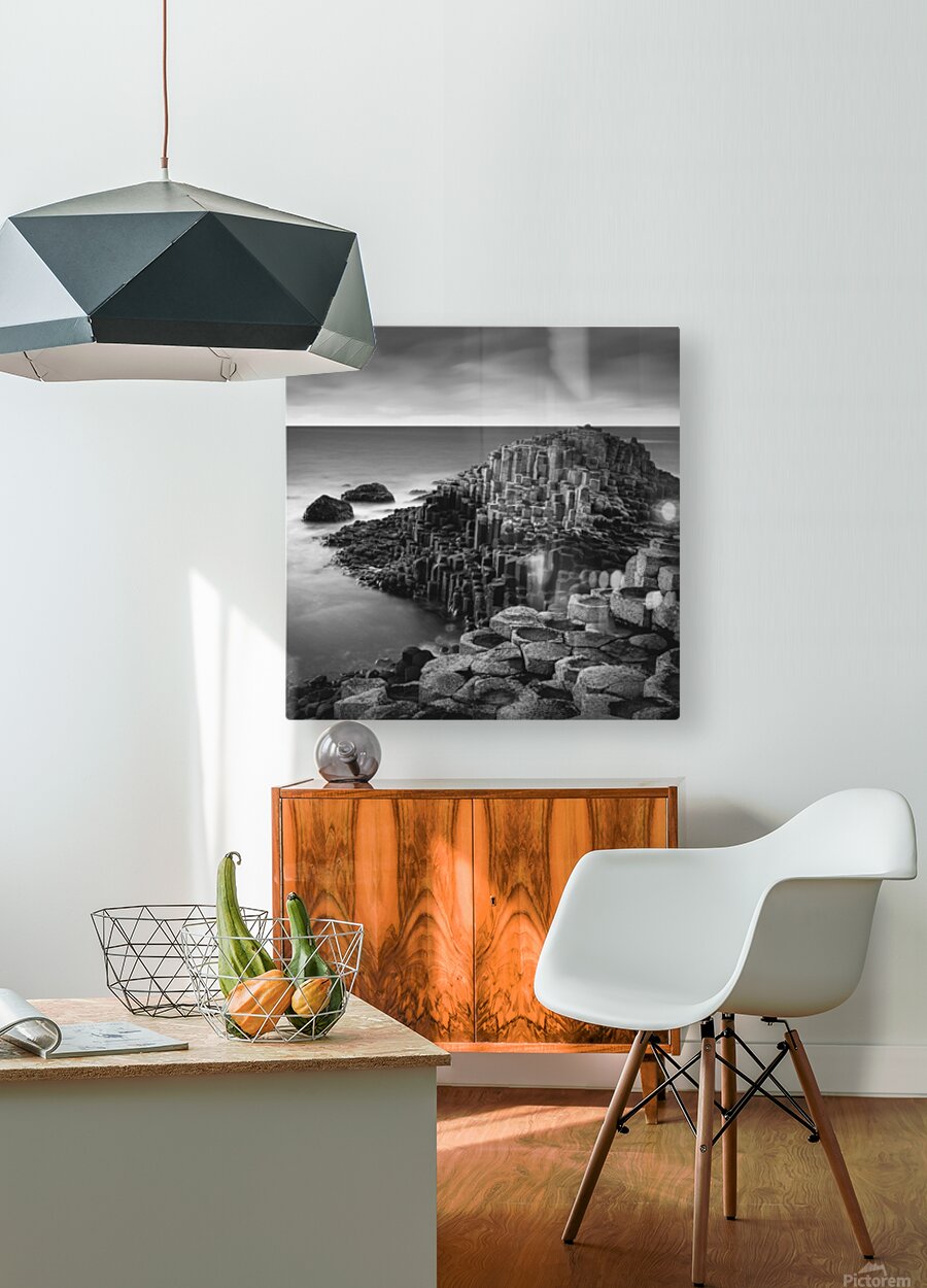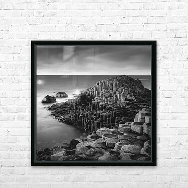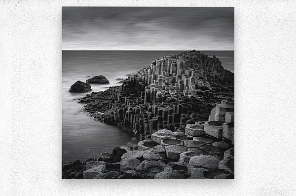 A striking monochrome view of the Giant’s Causeway in County Antrim, Northern Ireland, rendered with the soft, glassy effect of a long exposure. The distinctive hexagonal basalt columns extend into the frame like stepping stones into the sea, their rigid geometry contrasting with the smooth blur of the surrounding water. Gentle tonal gradients replace colour, emphasising the texture of the rock and the sculptural quality of the scene. Formed by ancient volcanic activity some 60 million years ago, the Giant’s Causeway is steeped in both geological and mythological significance. In this photograph, the long exposure smooths the tide into a silken haze, creating a quiet, almost dreamlike atmosphere that invites reflection. The absence of colour draws attention to the interplay between form and light, turning a famous landmark into something timeless and meditative. This image is available as wall art and across a range of other formats to complement different spaces and interior styles.
