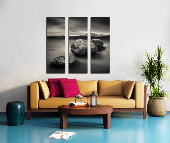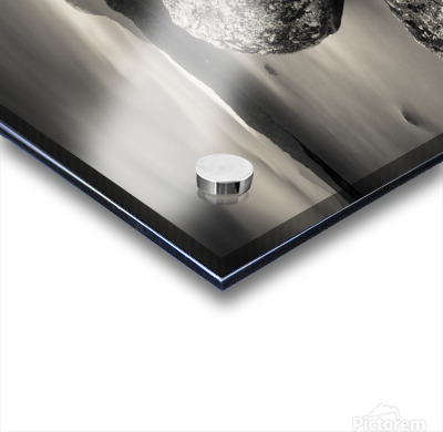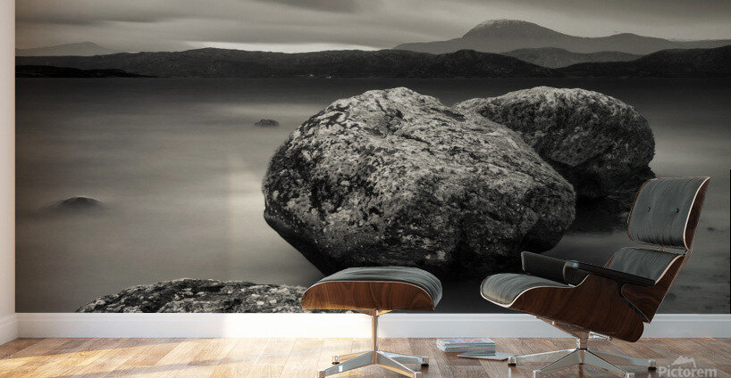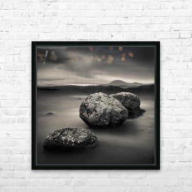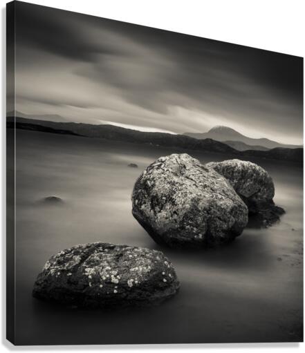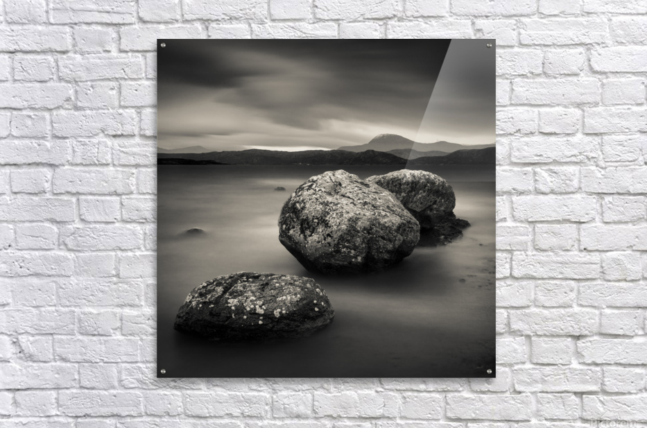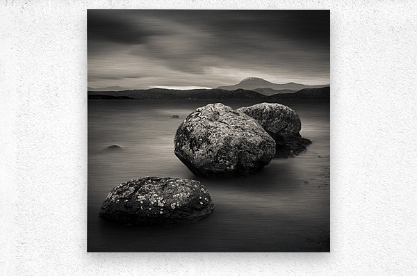 A monochrome photograph of three rocks on a beach at low tide in Wester Ross, Scotland. A long exposure has been used to smooth the surrounding sea, w...[+]