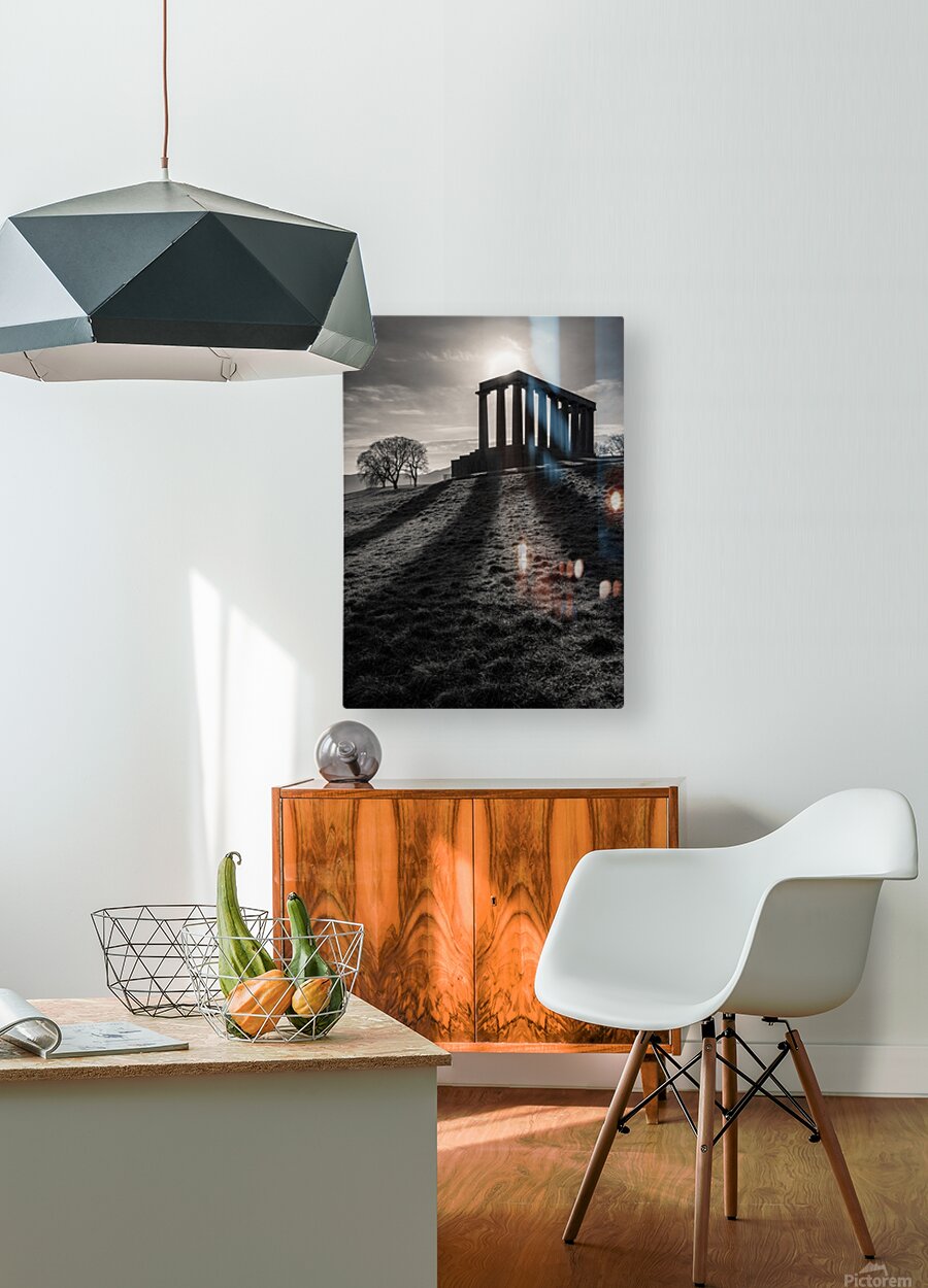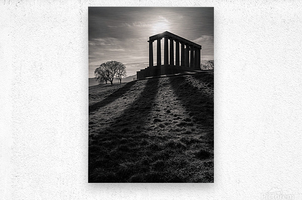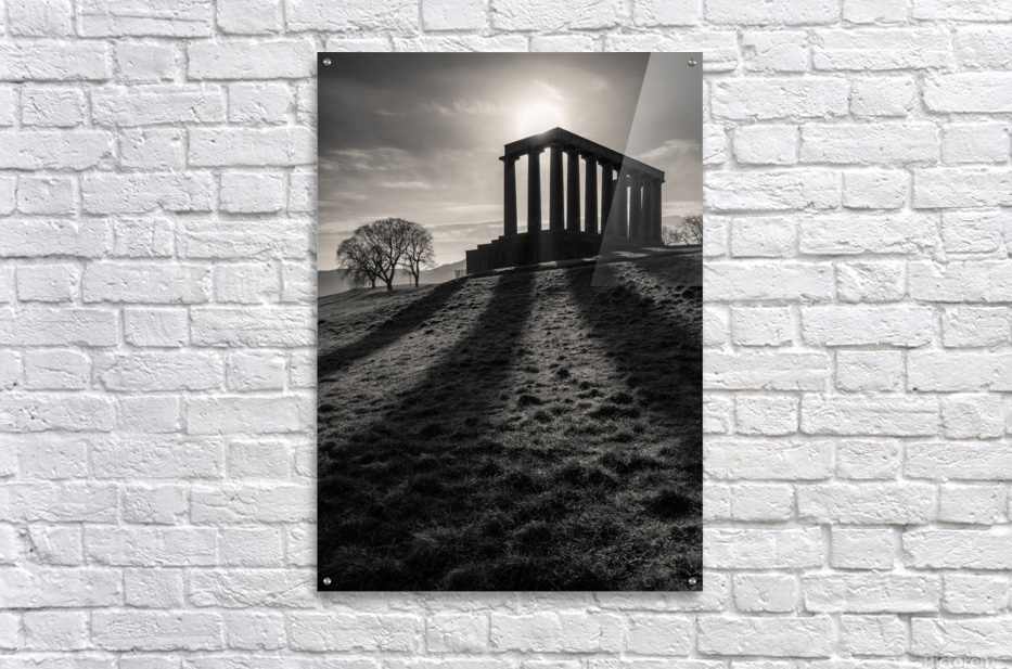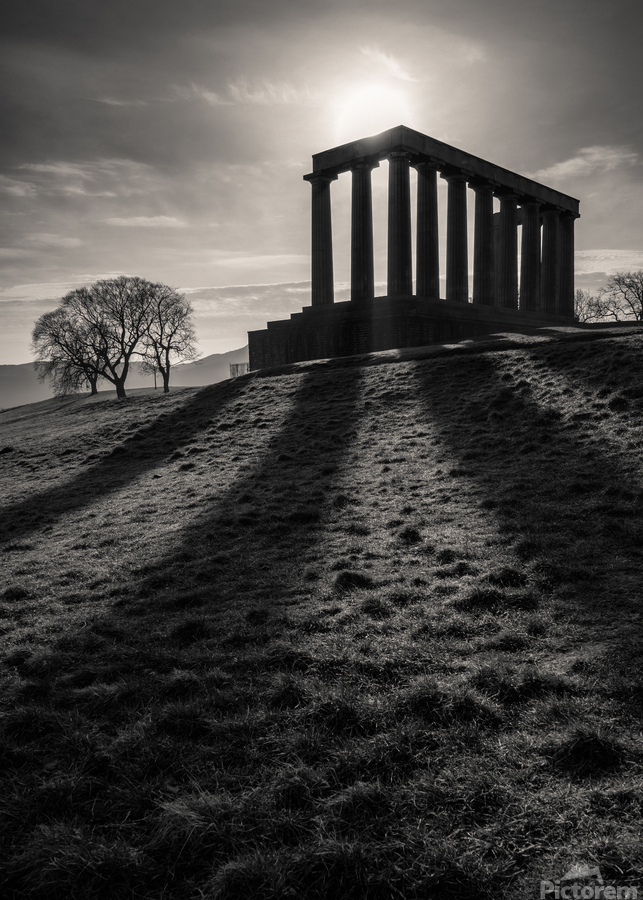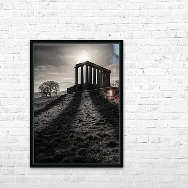 A monochrome photograph capturing the early morning sun casting long shadows from the National Monument of Scotland on Calton Hill in Edinburgh. This ...[+]