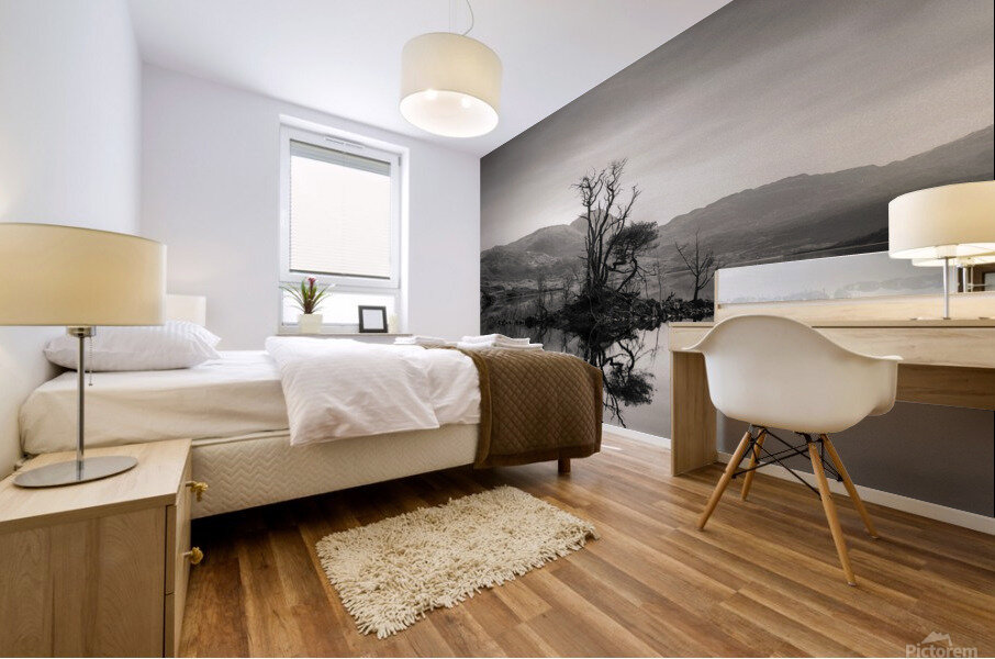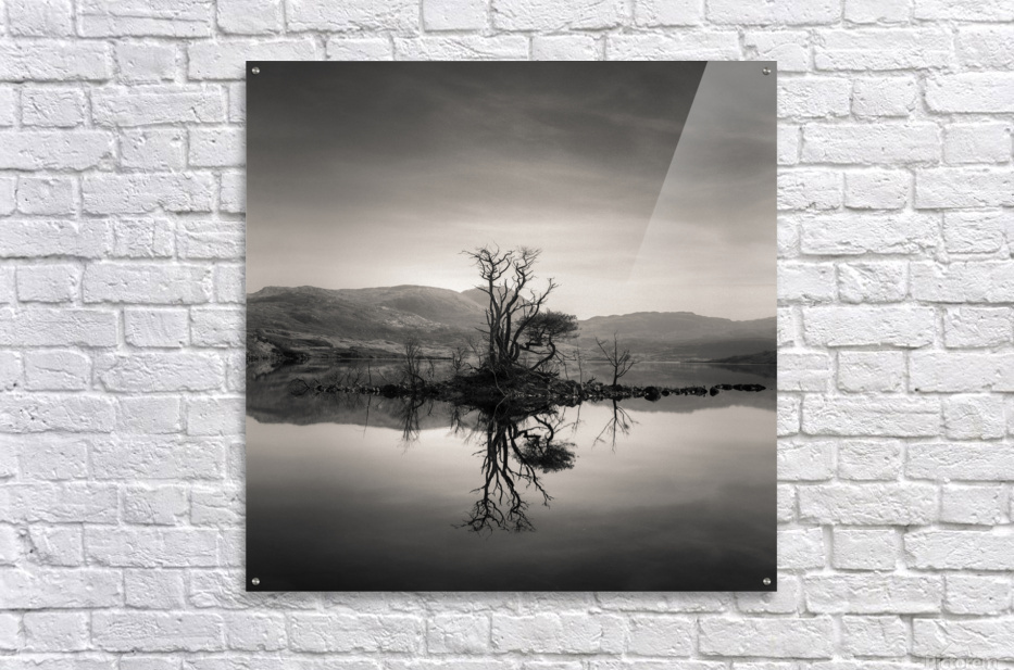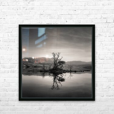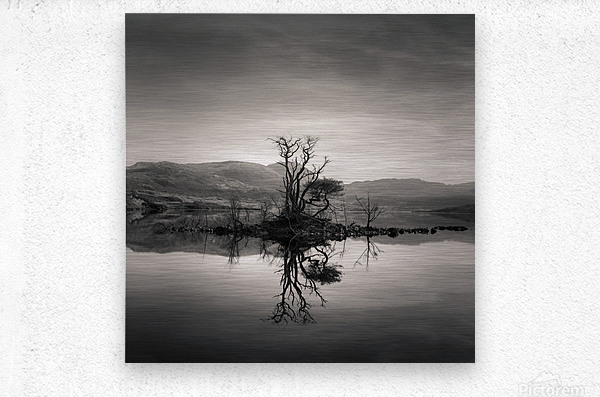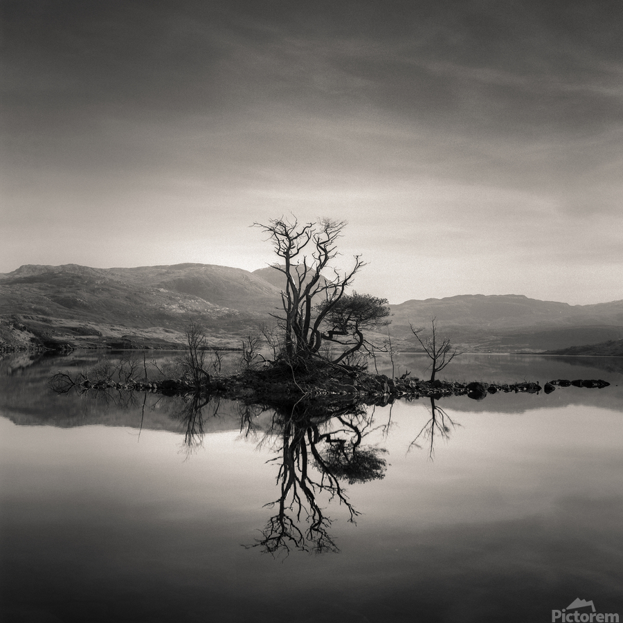 A monochrome photograph capturing the reflection of an ancient, leafless tree in Loch Assynt, set against the serene waters of the Scottish Highlands....[+]