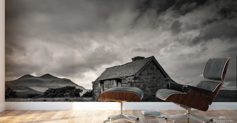 An abandoned Highland bothy stands alone in the rugged landscape of Sutherland, Scotland, with the distant silhouettes of Cul Mor and Suilven rising against the horizon. Overhead, dramatic clouds add a sense of atmosphere and isolation. A great photograph for those who appreciate the untamed beauty of Scotland’s wilderness.