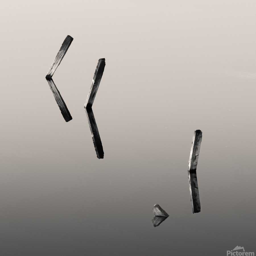 Four fence posts reflecting on the surface of a still Scottish loch, South Uist, Outer Hebrides, Scotland, UK.