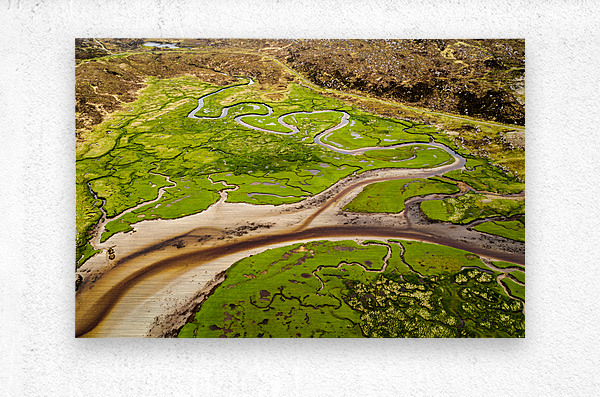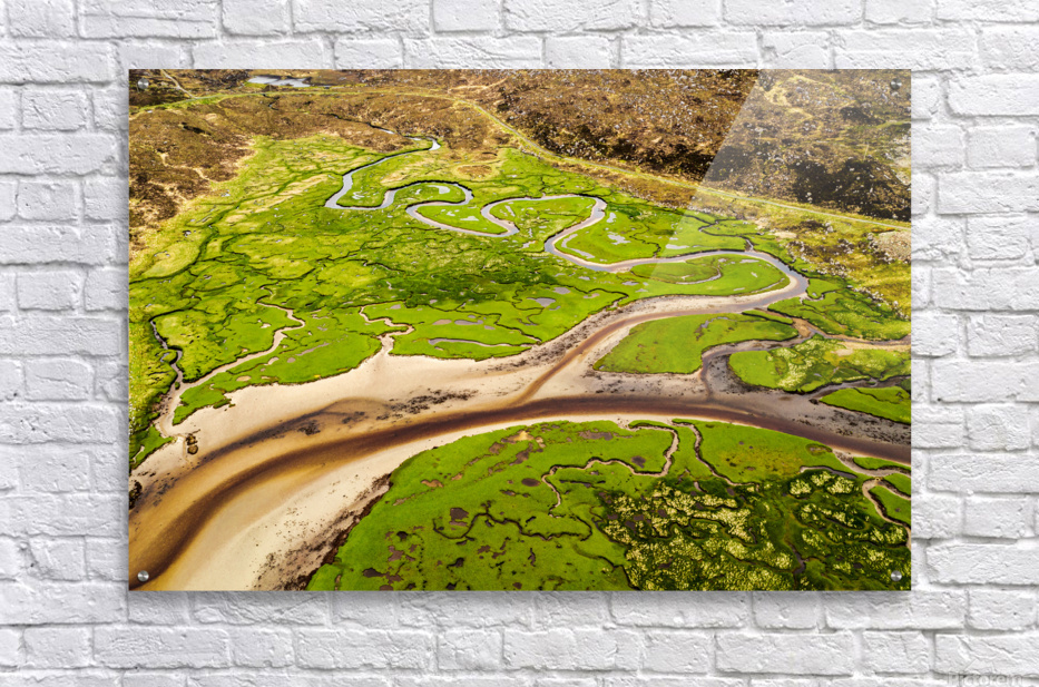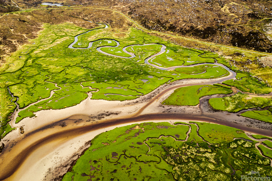 An aerial view of lush green marshland on the Isle of Harris, Outer Hebrides, Scotland, UK.