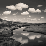 A tranquil stretch of Lon Achadh na h-Aibhne flows gently through the remote landscape of Inchkinloch in Sutherland, Scottish Highlands. The calm water perfectly mirrors the soft, scattered clouds above, creating a seamless blend of sky and land. Surrounding the river, patches of rough grass and heathland stretch out, their textures softened by the monochrome tones. Inchkinloch lies within the vast, sparsely populated region of Sutherland, known for its wild, open spaces and rugged natural beauty. This part of the Scottish Highlands is shaped by rolling hills, moorland, and an ever-changing sky that brings a quiet, reflective mood to the landscape. Ideal for admirers of serene natural scenes and minimalist monochrome photography, this image is available as wall art and across a wide range of formats to suit your space or style. It suits interiors looking to evoke calmness and connection to the remote Scottish wilderness.