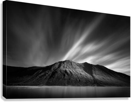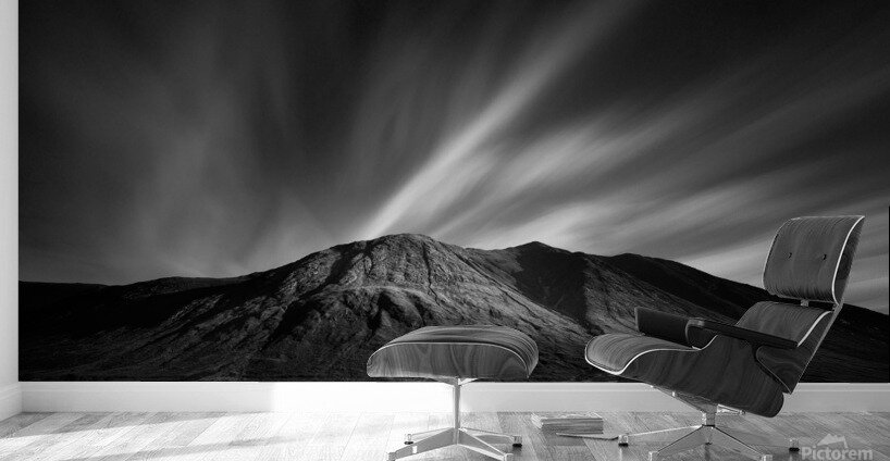 A monochrome long exposure photograph of Ben Starav emerging from the shore of Loch Etive, Scotland. The image captures dramatic clouds streaking across the mountain peak, with sunlight accentuating parts of the rugged terrain. This high-contrast, minimalist black-and-white shot emphasizes the stark beauty and natural grandeur of the Scottish Highlands. A great photograph for landscape enthusiasts, and anyone seeking a dramatic representation of Scotland’s mountainous scenery.