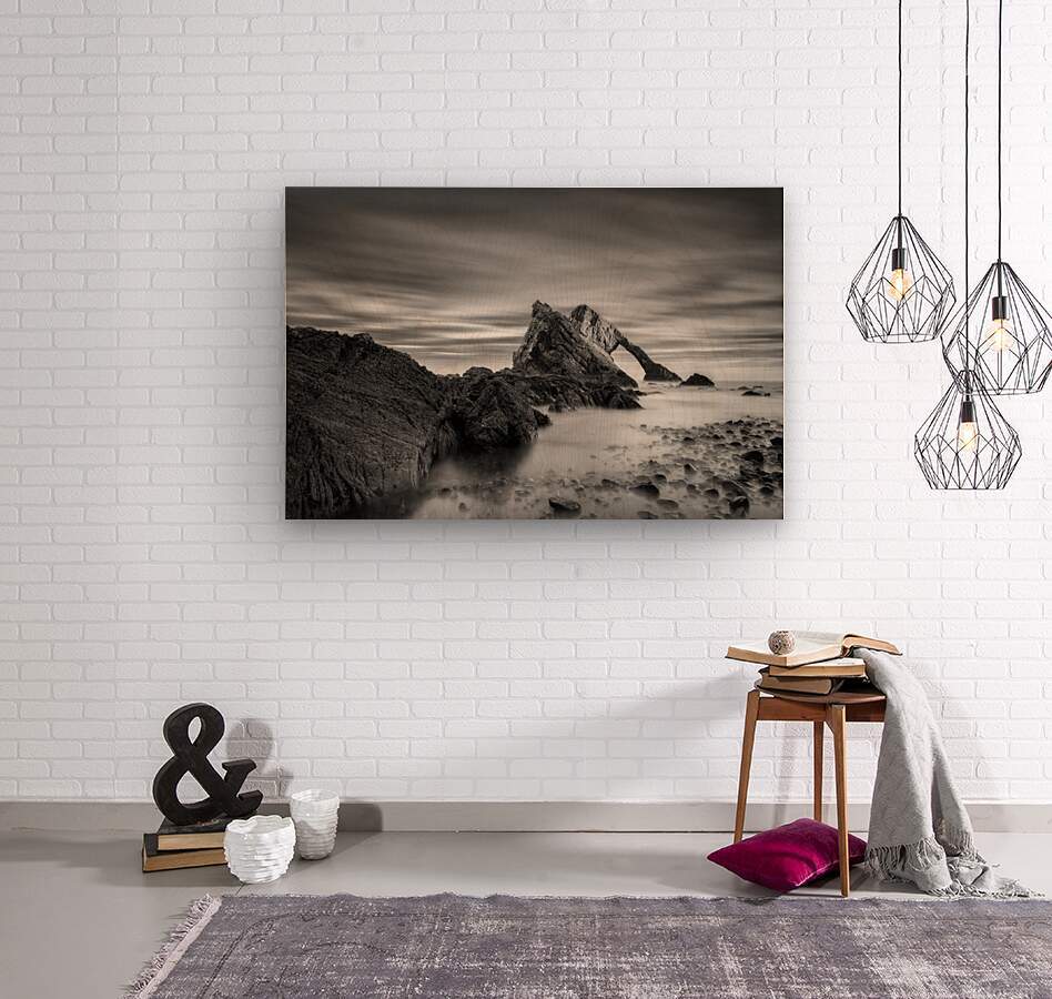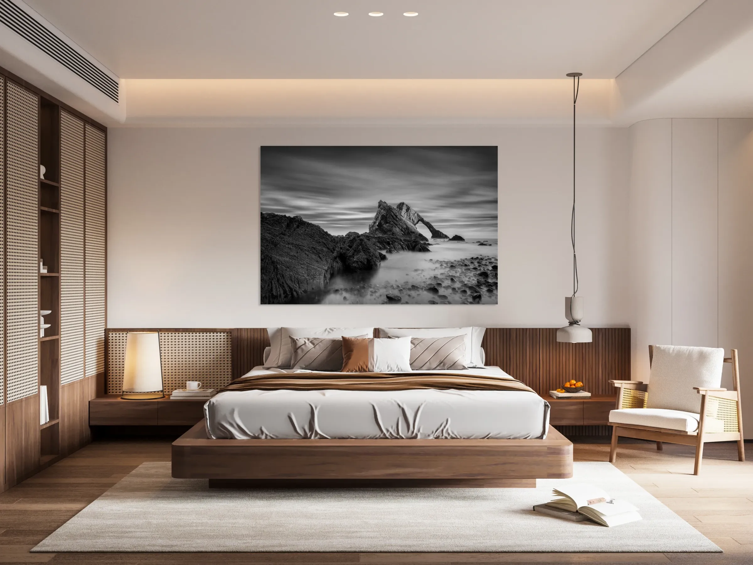 A black and white, long exposure view of Bow Fiddle Rock at Portknockie, Aberdeenshire, Scotland. The natural sea arch rises from the North Sea, its quartzite form standing prominently against the water. The long exposure smooths the surrounding sea, creating a calm, almost ethereal atmosphere around the distinctive arch. Bow Fiddle Rock is a well-known landmark on Scotland’s north-eastern coast, shaped over centuries by the relentless erosion of the sea. Its arch resembles the tip of a violin bow, giving the rock its name, while the surrounding cliffs and coastline showcase the rugged beauty of the region. A perfect image for anyone who enjoys coastal landscapes, dramatic natural formations, or the quiet beauty of Scotland’s shoreline. This image is available as wall art and across a wide range of formats to suit your space or style.
