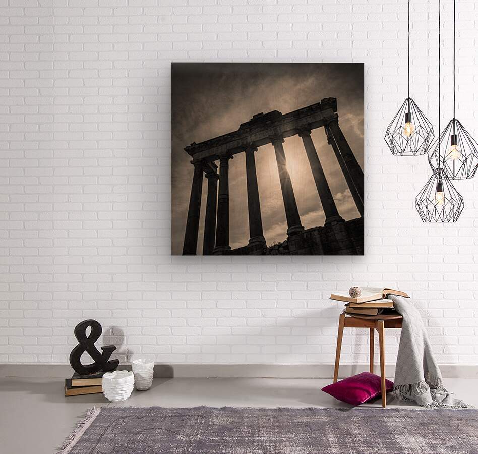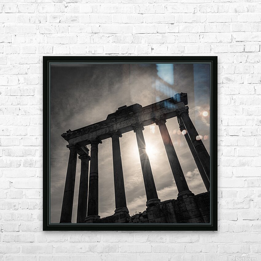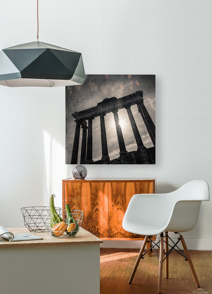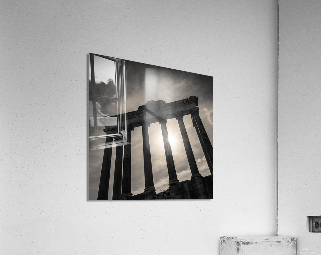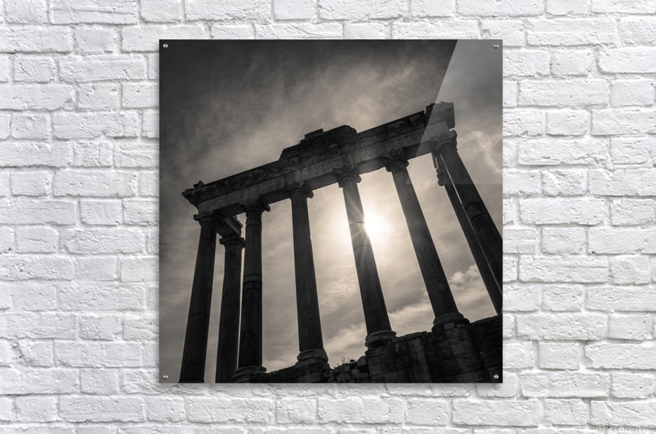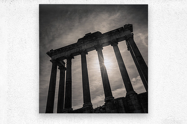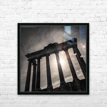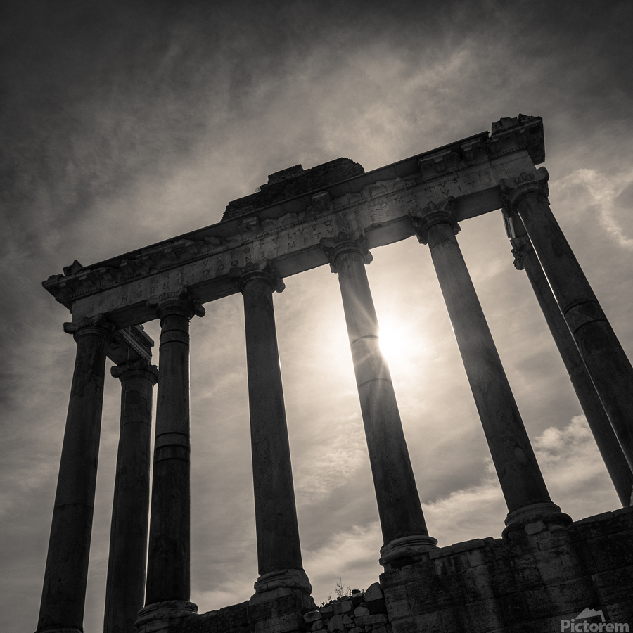 A monochrome photograph capturing the ancient ruins of the Roman Forum with a striking silhouette against the midday sun in Rome, Italy. This image hi...[+]