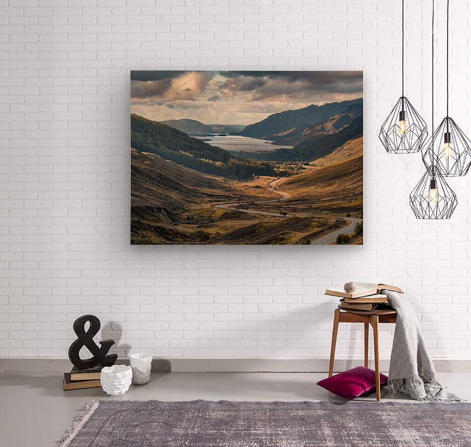 A winding road gracefully descends through Glen Docherty, leading towards the serene Loch Maree in the Scottish Highlands, Scotland. This captivating landscape captures the essence of Scotland's natural beauty, with its lush greenery and rugged terrain. A perfect photograph for landscape enthusiasts and those seeking to enhance their collection of Scottish scenery.