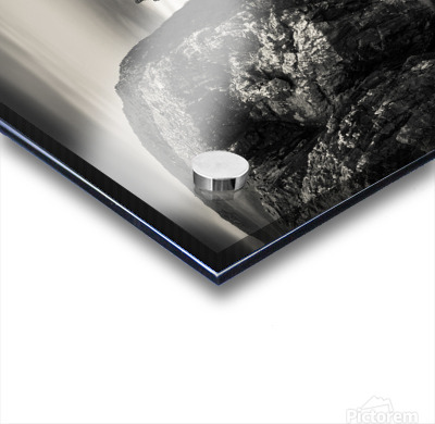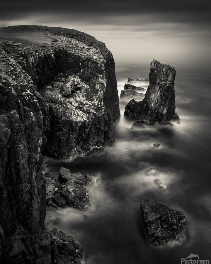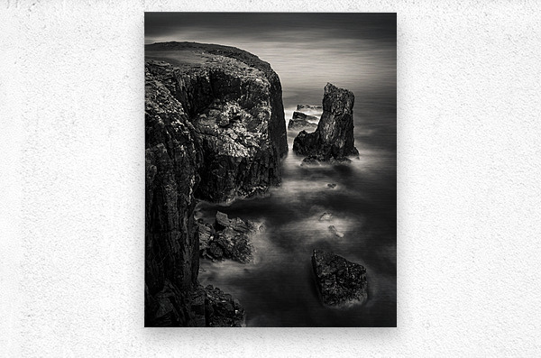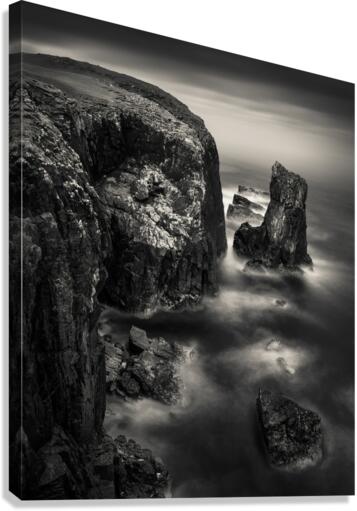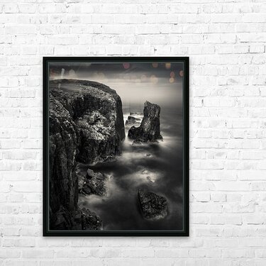 A monochrome photograph capturing weathered rugged cliffs under stormy skies at the Butt of Lewis, Isle of Lewis, Scotland. The stark contrasts and te...[+]