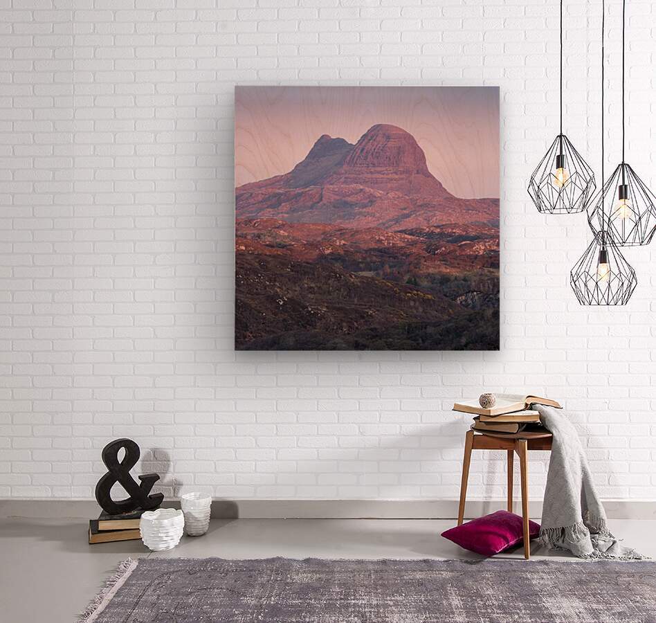 The late evening sun lights up Suilven, one of Scotland's most iconic and recognizable mountains, located in the Scottish Highlands. The sky is painted in beautiful pastel pink and purple hues, casting a serene and enchanting glow over the mountain. This image perfectly showcases the natural beauty and unique landscape of Scotland's Highlands.