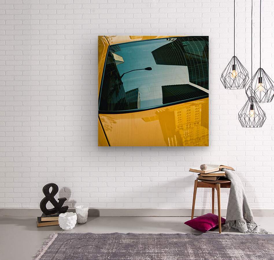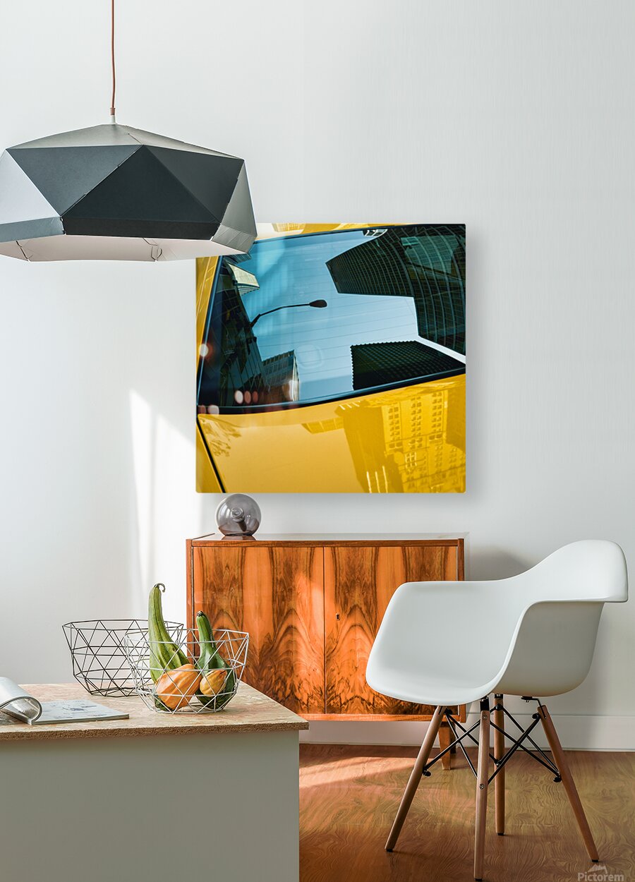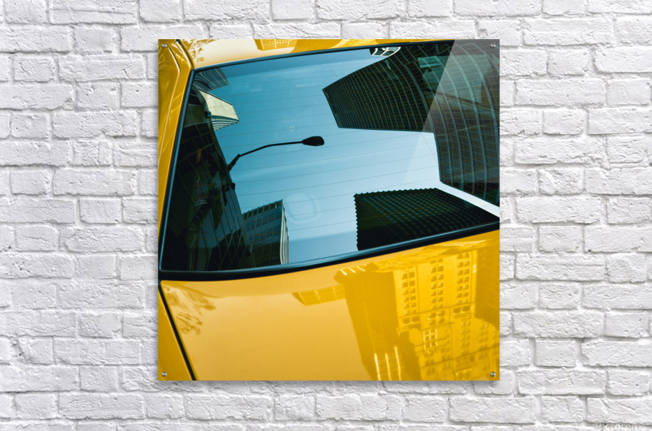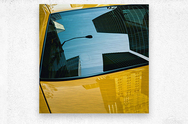 A photograph capturing New York skyscrapers mirrored in the rear window of an iconic yellow taxi cab. This image showcases the vibrant energy of New Y...[+]