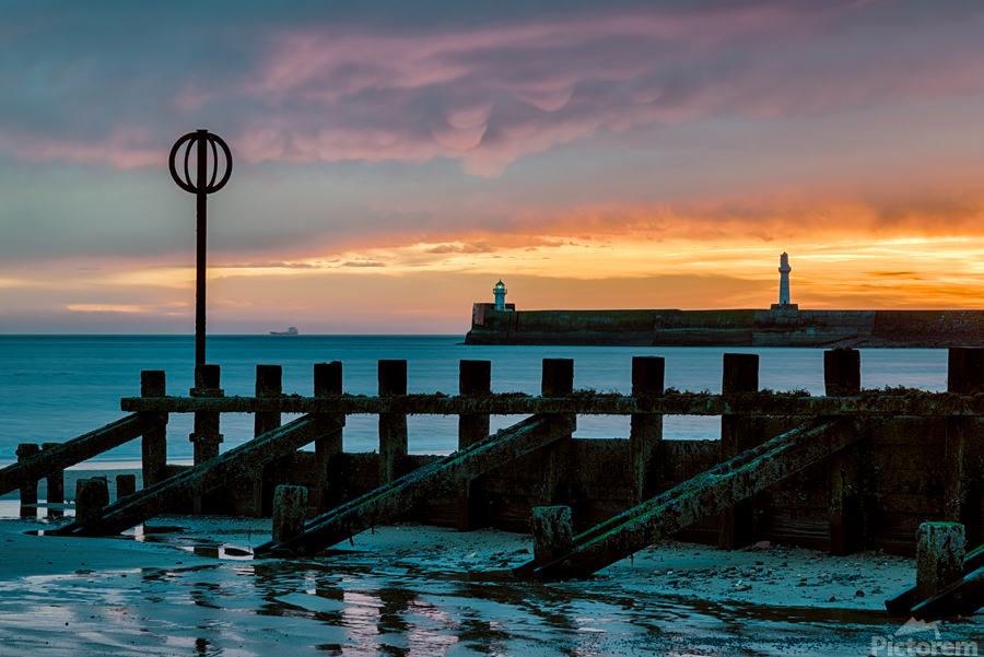 A serene dawn breaks over Aberdeen Harbour North Pier in Aberdeen, Aberdeenshire, Scotland. Sea groynes in the foreground are silhouetted against the vibrant morning sunrise, with a ship visible far out to sea. The photograph captures the tranquil beauty of the Scottish coastline at sunrise. Perfect for lovers of serene coastal landscapes and Scottish coastal photography.