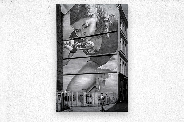 A black and white photograph captures the "Honey...I Shrunk The Kids" mural by artist Smug (Sam Bates) on Mitchell Street in Glasgow, Scotland. The artwork depicts a colossal girl with a magnifying glass, appearing to pick up objects from the street. In this image, an unsuspecting man in a suit walks between her fingers, enhancing the mural's playful perspective. This photograph is ideal for art enthusiasts, urban explorers, and those interested in Glasgow's vibrant street art scene. ..... Please note: This image has a slightly grainy texture because it was photographed on analog film.